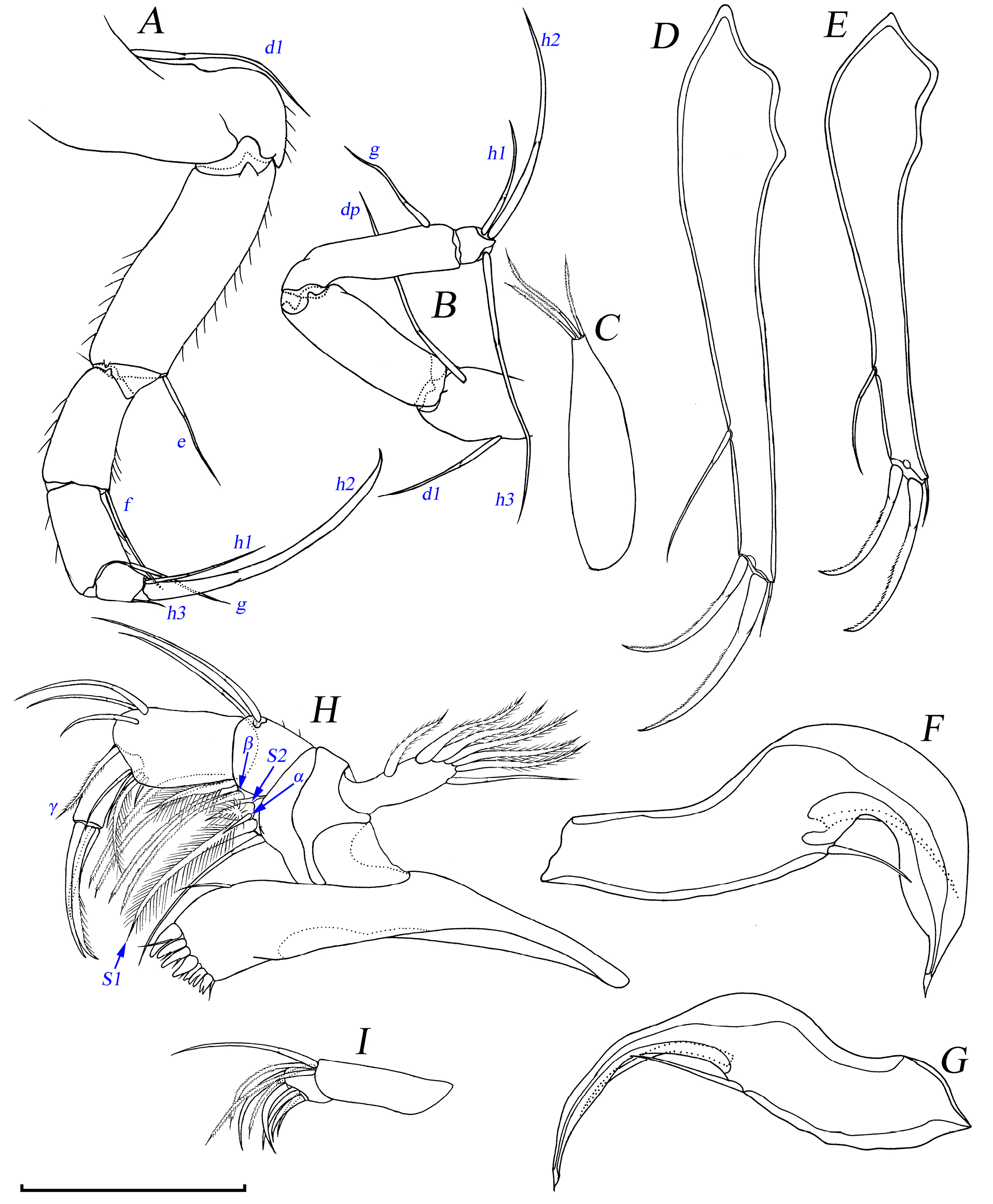 Рис. 12. Candona uschunica Mazepova 1990, рисунки конечностей самки (A–C, E, H, I) и самца (D, F, G): A – L6; B – L7; C – пальпа L5 самки; F – правая пальпа L5 самца; G – левая пальпа L5 самца; D, E – UR; H – мандибула; I – пальпа максиллулы. Масштаб 100 мкм.