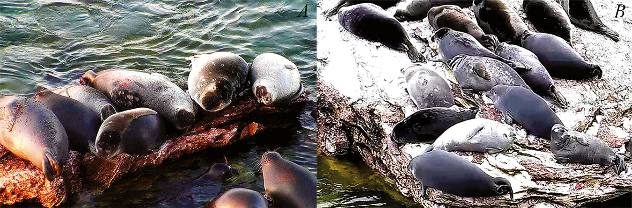 Рис. 1. Поражения кожи у байкальской нерпы на лежбище в 2017 г. (A) и 2021 г. (B). Фото Е. А. Петрова с материалов видеосъемки. Из: Петров и др. (2021а).
