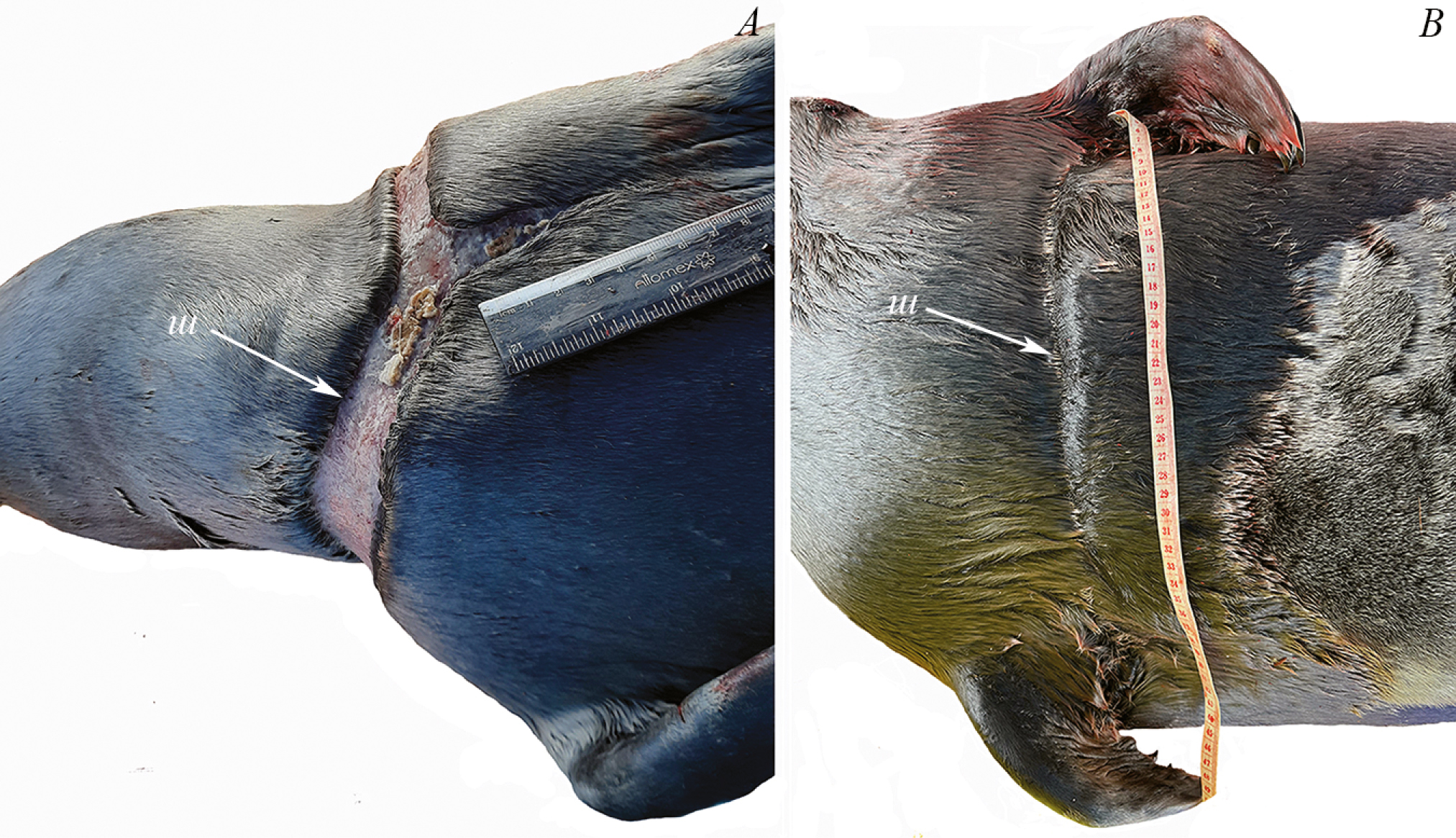 Рис. 3. Шрамы на коже у взрослых самок № 8 (A) и № 12 (B): ш – шрам.