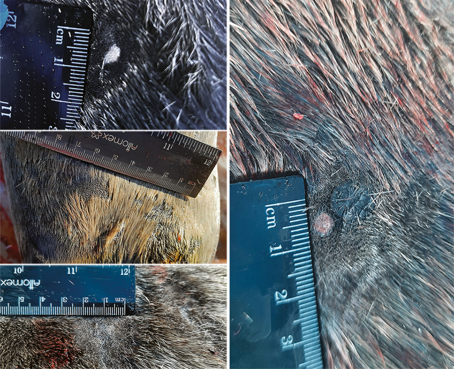 Рис. 4. Участки алопеций на коже байкальской нерпы (слева, сверху вниз – № 1, самка, 2+; № 2, самка, 1+; № 4, самец, 1+; справа – № 5, самка, 2+).