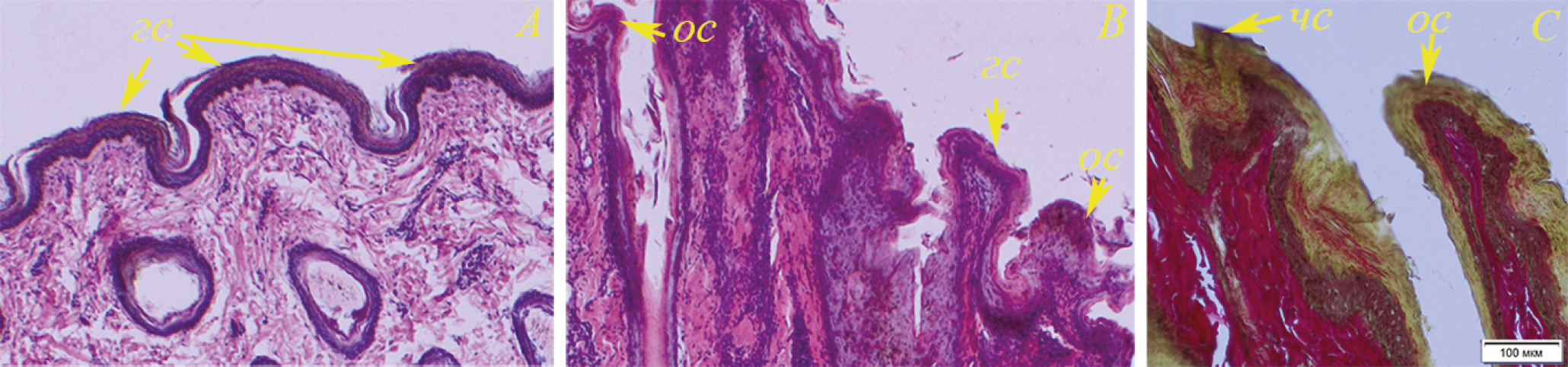 Рис. 6. Складки эпителия байкальской нерпы в коже туловища (A) (№ 2, самка, 1+) и ласт (B, С) (№ 5, самка, 2+): гс – грибовидные складки, ос – округлые складки, чс – чешуйчатые складки. Окраска гематоксилином с эозином (A, B), окраска Вейгерт – Ван Гизон (С).