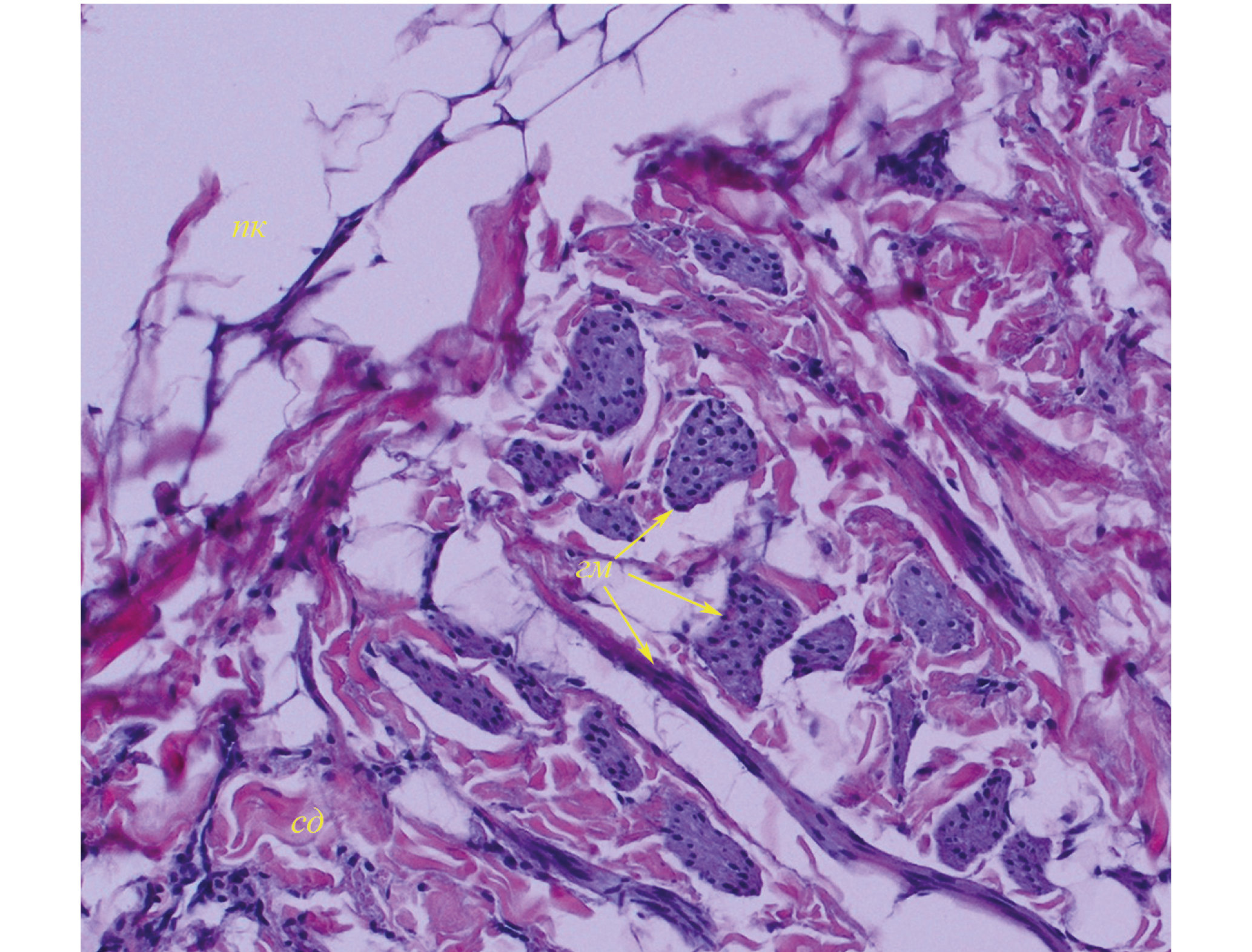 Рис. 8. Гладкие мышцы дермы байкальской нерпы (№ 9, самец, 2+): сд – сетчатый слой дермы, гм – пучки гладких мышц (указывают стрелки), пк – подкожная жировая клетчатка (гиподерма). Окраска гематоксилином с эозином.