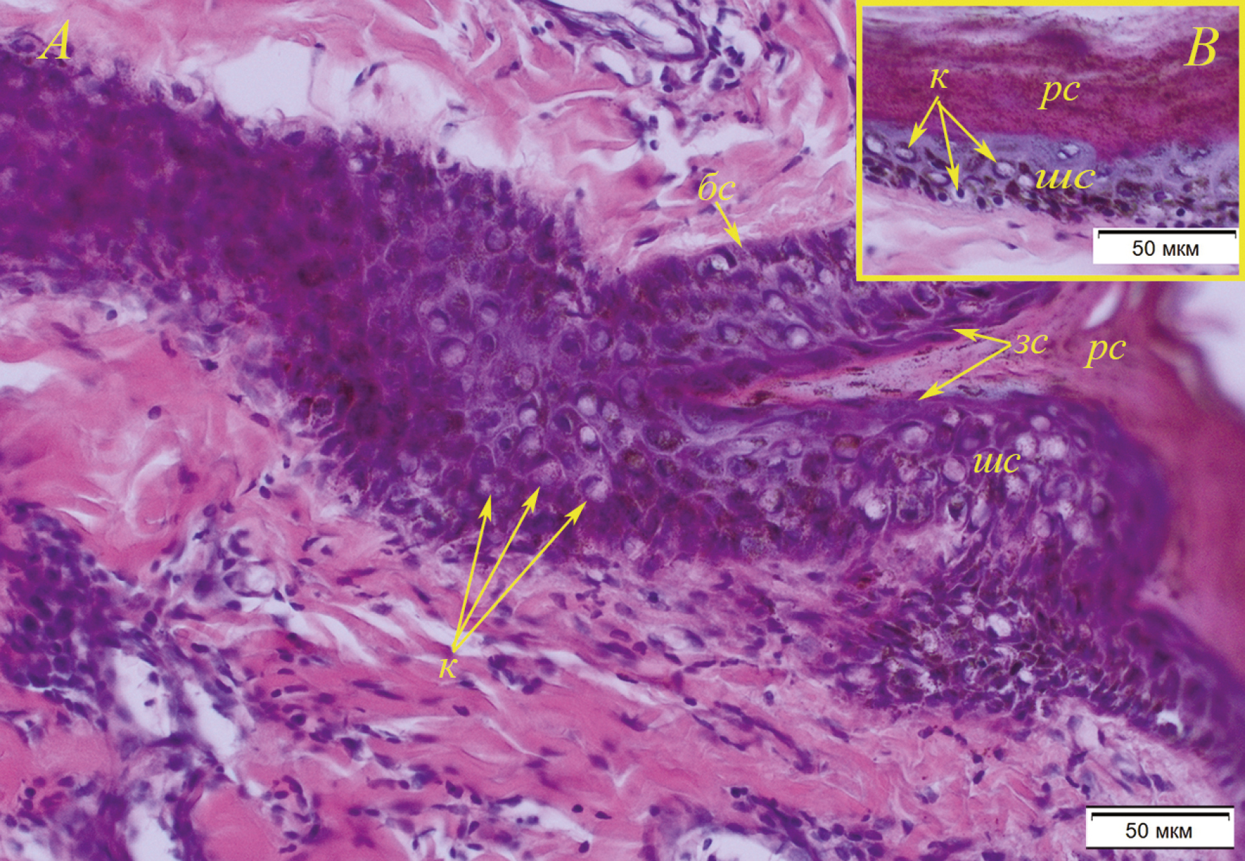 Морфометрия кожи у исследуемых животных представлена в табл. 2. Эпидермис у неполовозрелых байкальских нерп был толще в области живота, максимальная его толщина отмечалась у двухлетней особи № 1 и составила 58.4 ± 3.82 мкм. У половозрелых животных – особи № 10 – максимальная толщина эпидермиса была в ластах 89.1 ± 7.74 мкм. Клетки базального слоя цилиндрической формы. В ластах двухлетних животных базальный слой имел бо́льшую высоту, даже в сравнении с половозрелыми нерпами. Даже у одного животного количество рядов клеток в шиповатом слое может колебаться в среднем от 2 до 6 рядов, клетки имеют шиповатую форму с округлыми или овальными ядрами. Наибольшая толщина шиповатого слоя у неполовозрелых особей была отмечена в эпидермисе живота у особи № 1 (13.1 ± 1.93 мкм), у половозрелых – в эпидермисе спины у нерпы № 7 (15.0 ± 1.77 мкм) и ласт у № 10 (17.9 ± 2.15 мкм). Зернистый слой чрезвычайно тонкий, представлен 1–2 слоями веретеновидных клеток, его толщина у исследуемых животных составляла от 4.1 до 6.4 мкм. Роговой слой у исследованных нерп хорошо выражен и имеет максимальную толщину в сравнении с толщиной остальных слоев эпидермиса (табл. 2). Бо́льшая толщина рогового слоя описана у половозрелых нерп в сравнении с неполовозрелыми. Максимальная толщина рогового слоя установлена у 6-летнего самца в коже ласт (особь № 10, табл. 2). Роговой слой частично рыхлый, варьирует, как и шиповатый, по толщине даже в пределах одного среза; на некоторых участках имеются пласты отслаивающихся чешуек. В клетках эпидермиса присутствуют гранулы пигмента, которые встречаются не только в базальном и шиповатом слоях, но и в роговом.