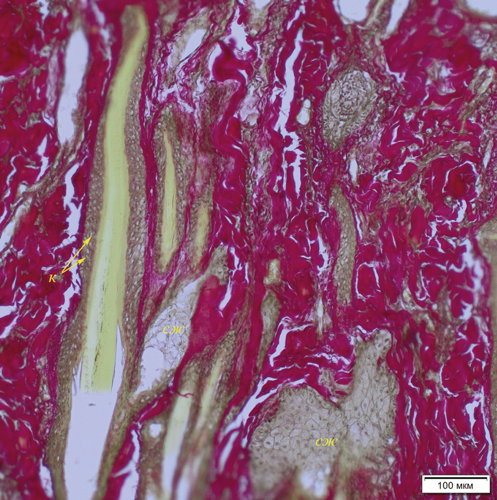 Граница между сосочковым и сетчатыми слоями дермы не выражена. Сосочковый слой образован плотно лежащими пучками коллагеновых волокон, расположенными параллельно и вертикально по отношению к поверхности кожи. Сетчатый слой состоит из переплетенных толстых пучков коллагеновых волокон, идущих в разном направлении. Промеры толщины дермы представлены в табл. 2. Дерма кожи ласт у всех исследуемых животных была тоньше в сравнении с дермой кожи туловища животных, в то время как толщина эпителия ласт немного меньше толщины эпителия кожи живота или равна ей.
