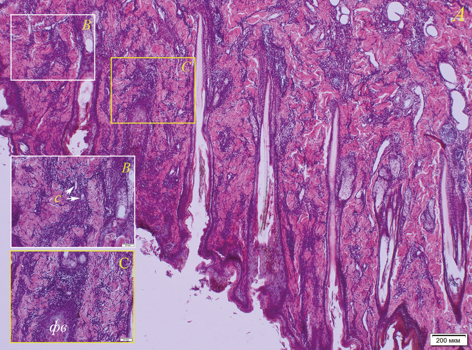 Гистологическое строение кожи. Норма. Кожа туловища и ласт байкальской нерпы покрыта многослойным плоским ороговевающим эпителием (рис. 5), имеющим складчатую структуру на всей ее поверхности. В эпидермисе туловища складки более выражены, имеют в сечении форму гриба (с узким основанием и широкой вершиной) и наклон в сторону волоса (рис. 6А). В эпителии ласт складки гораздо меньше по размеру и отличаются разнообразной формой: округлой, грибовидной и чешуйчатой (6B, 6C).