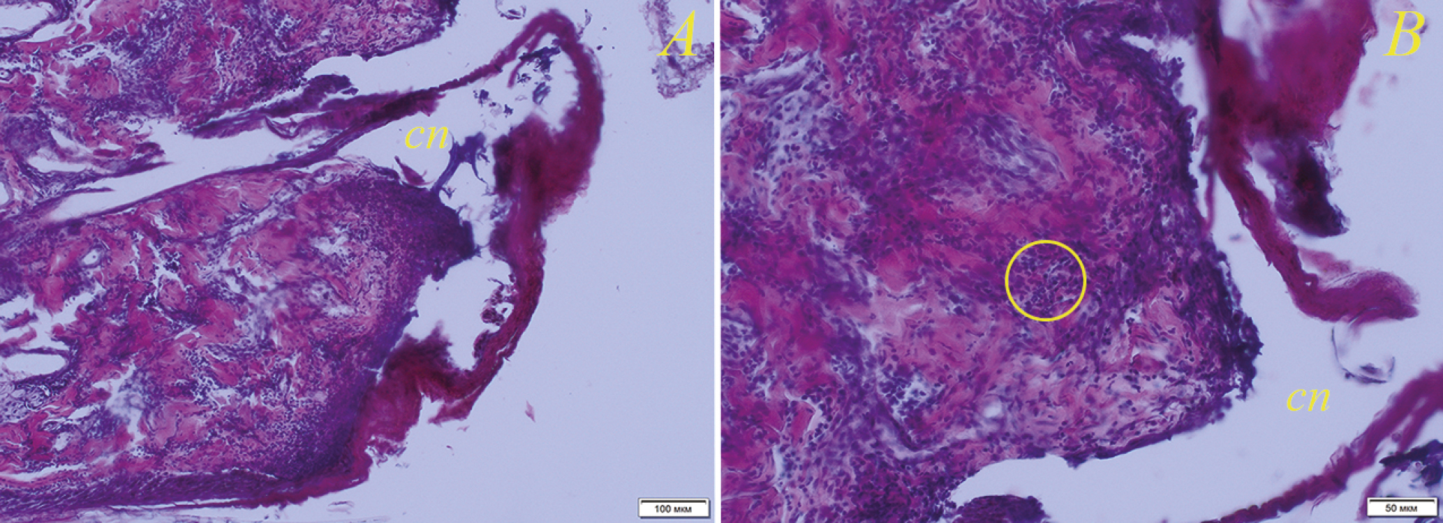 Микроскопическое исследование пораженной кожи байкальской нерпы показало наличие двух видов изменений. Первый сопровождался явлениями койлоцитоза, обнаруженными в эпидермисе, а не в слизистых оболочках, как у дельфинов (см. ниже), при этом признаки воспаления в поврежденном эпителии отсутствовали. Воспалительный инфильтрат присутствовал субэпидермально вокруг кровеносных сосудов и волосяных фолликулов, и его количество увеличивалось в глубине дермы, например в ластах на уровне расположения потовых желез. В связи с этим мы не имеем доказательств прямого воздействия патогена вирусной природы на кожу нерпы. В то же время состав воспалительного инфильтрата (преобладают лимфоциты с небольшим количеством гистиоцитов) свидетельствует об ответной реакции на патоген, который имеет вирусную природу. Не исключено, что данные патологические изменения связаны с воздействием нескольких патогенов, действие которых происходило в разное время.