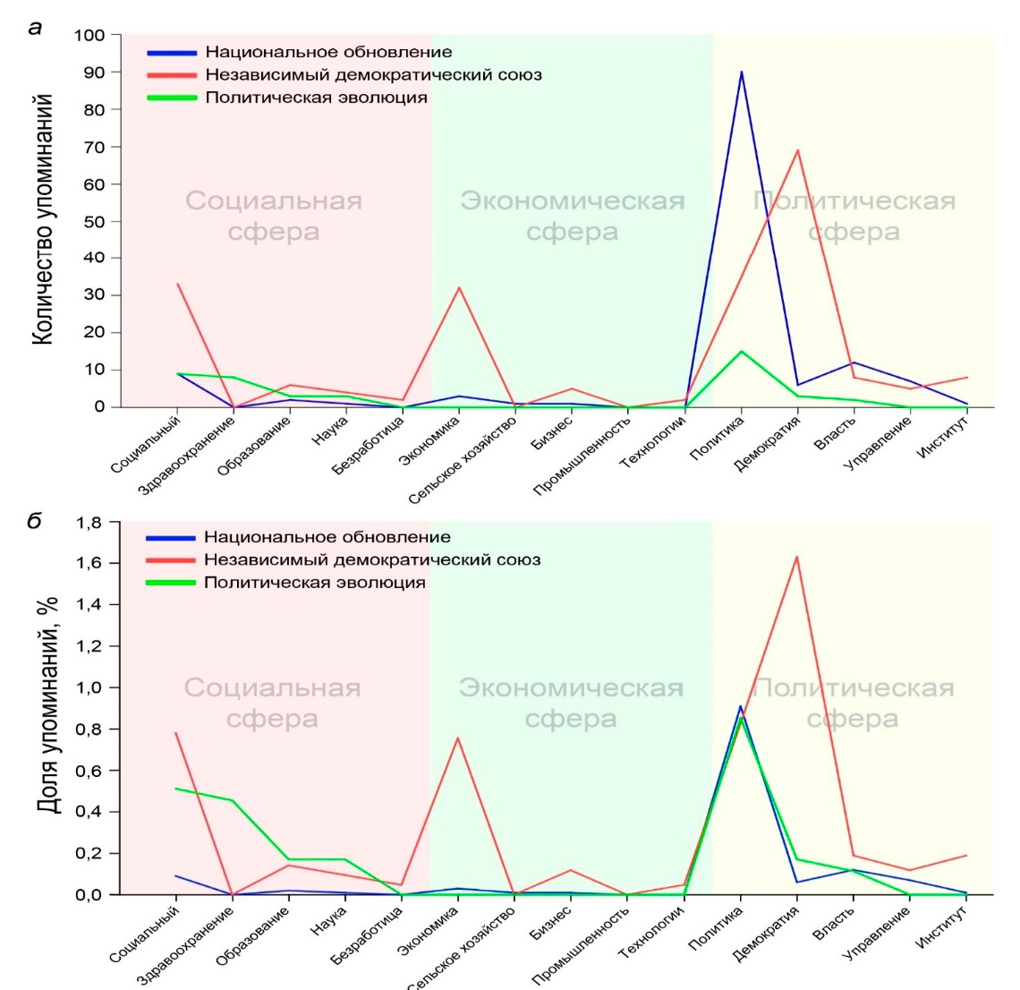 В качестве единиц анализа мы возьмем понятия и смысловые лексические единицы, относящиеся к трем исследуемым сферам деятельности, — социальной, политической и экономической. В социальной сфере в качестве лингво-единиц используются следующие слова: социальный (это, возможно, спорная дефиниция в силу широты трактовки, однако было решено не отказываться от нее, так как она является определяющей для данной статьи), здравоохранение, образование наука и безработица. Экономическая сфера анализируется с помощью таких маркеров, как экономика, промышленность, предпринимательство и бизнес, технологии и инновации, сельское хозяйство. Политическая сфера выражается через такие слова, как политика, демократия, власть, управление, институт. Выбранные понятия отражают несколько параметров успешности программ политических партий и направленность (области) их возможной политики.