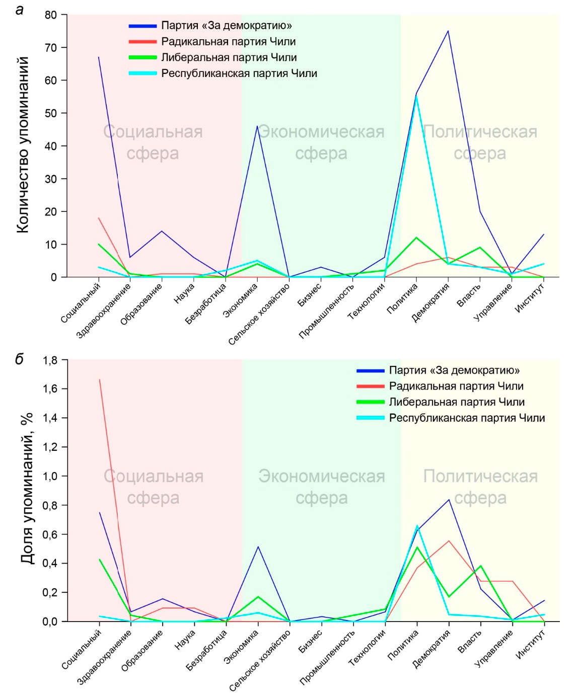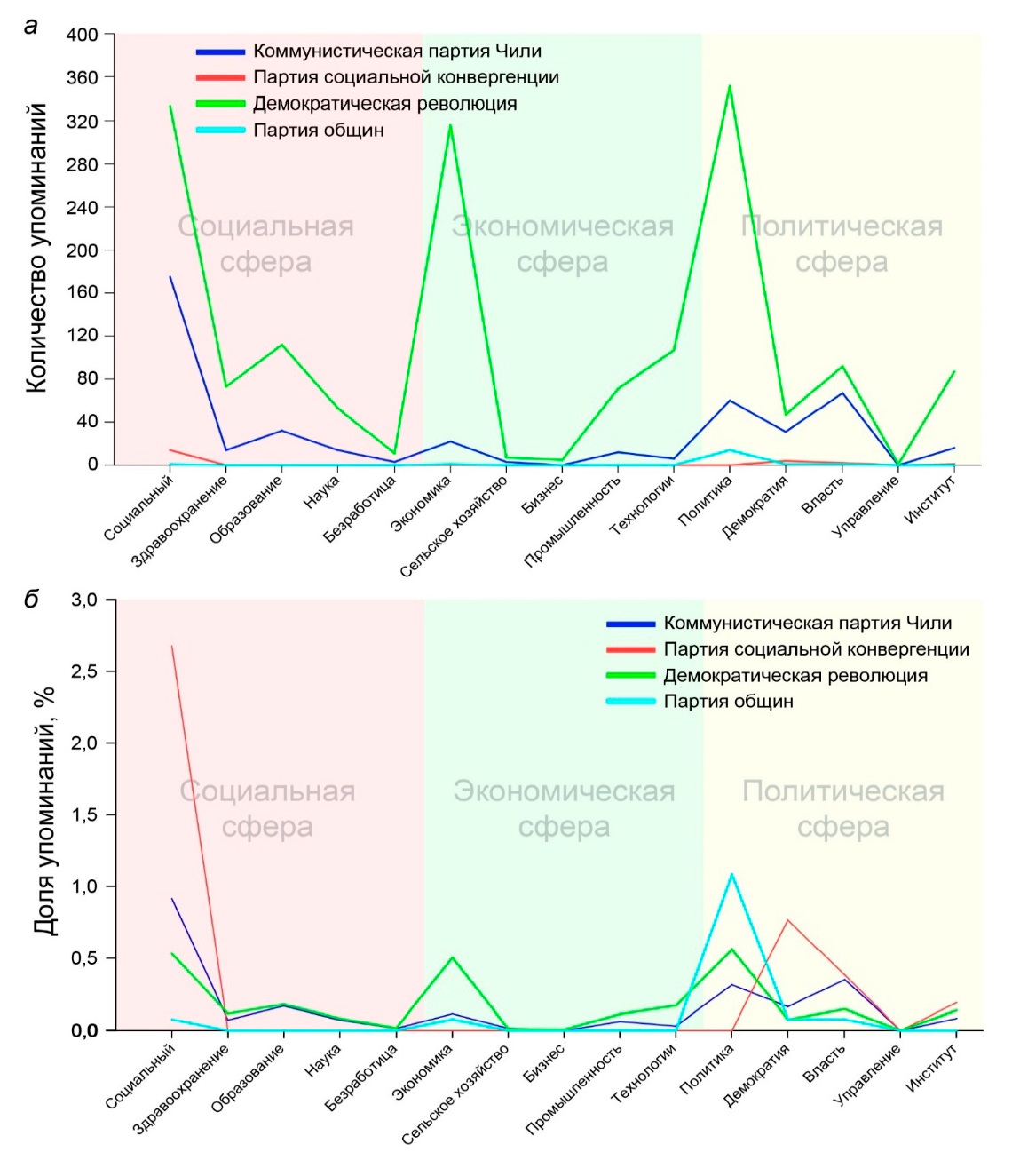Ниже представлен результат контент-анализа программ политических партий Чили, сформировавших новый состав палат депутатов (конец 2021 г.). Ученые довольно регулярно проводят анализ текста программ политических партий: при помощи количественного и качественного изучения лингвистических единиц можно выявить как особенности политической картины мира эксперта-политолога, проводящего анализ, так и характеристики самых политических текстов, и в целом сделать вывод об используемых текстах как об инструменте информационных технологий.