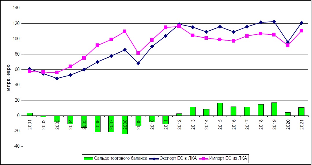 Тем не менее, динамика межрегиональной торговли остается важным показателем в отношениях ЕС с латиноамериканским регионом. За период с 2001 по 2021 г. товарооборот увеличился практически в два раза — с 118,3 млрд до 231 млрд евро. При этом отрицательное сальдо торгового баланса для ЕС в период с 2002 по 2011 г. сменилось на положительное после 2012 г. в связи с наращиванием и удорожанием европейского экспорта в страны ЛКА при сокращении стоимости импорта латиноамериканских сырьевых товаров. (см. график 1). Основными статьями товарного экспорта в 2002—2021 гг. были машины и оборудование, а также транспортные средства. На них пришлось более 27% в общем объеме поставок из Европы. Уровень поставок фармацевтической продукции увеличился с 4,5% в 2002 г. до 8,4% в 2021 г. Основными статьями товарного импорта ЕС из ЛКА стали руды черных и цветных металлов (ТН ВЭД 26), доля которых возросла с 5% в 2002 г. до 10,6%. Второе место в импортных поставках ЕС из ЛКА занимает минеральное топливо (ТН ВЭД 27), на него приходится 9% от общей стоимости товаропотока. Произошли структурные сдвиги в поставках в ЕС из ЛКА транспортных средств. Если в 2002 г. эти поставки составляли всего 1,7%, то в 2021 г. данный показатель увеличился до 6,1%, что указывает на важность сборочных производств в латиноамериканском регионе, ориентированных как на внутренний, так и на внешние рынки.