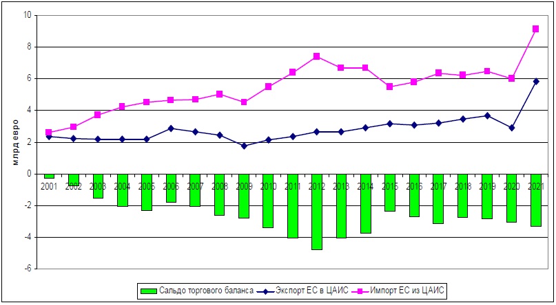 Товарооборот ЕС с центральноамериканскими странами в период 2001—2021 гг. увеличился в три раза — с 4,9 млрд до 14,98 млрд евро. При этом для торговли ЕС с этим субрегиональным объединением характерно устойчивое отрицательное сальдо торгового баланса (см. график 2).