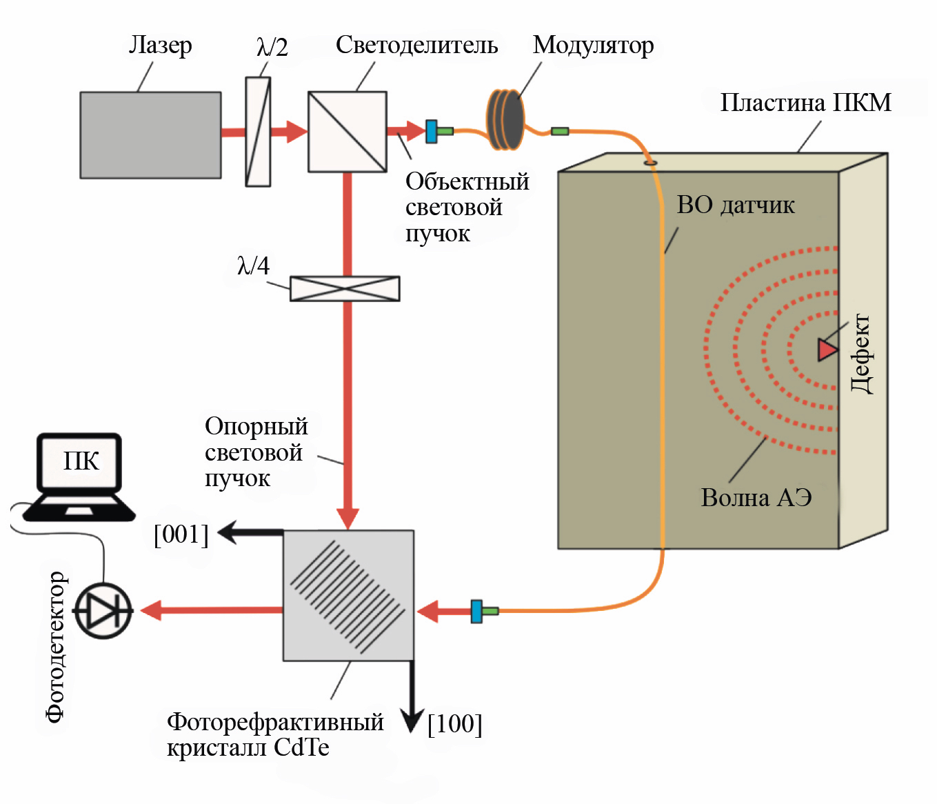 Оптическая схема системы регистрации АЭ показана на рис. 1. Волны АЭ, генерируемые развивающимися в материале дефектами, распространяясь по образцу ПКМ, воздействуют и на материал волоконного световода, приводя к модуляции фазы проходящего по нему лазерного излучения (длина волны 1064 нм). Далее фазомодулированный объектный световой пучок, полученный на выходе волоконного световода, направляется в фоторефрактивный кристалл теллурида кадмия (CdTe), где его интерференция с опорным пучком приводит к формированию динамической объемной фоторефрактивной голограммы [17]. В свою очередь, взаимодействие объектной и опорной волн на голограмме приводит к преобразованию модуляции фазы объектного пучка в модуляцию его интенсивности, которая регистрируется фотодетектором. Таким образом, использование волоконно-оптического световода в схеме адаптивного голографического интерферометра позволяет обеспечить регистрацию акустических сигналов, возникающих в ПКМ.