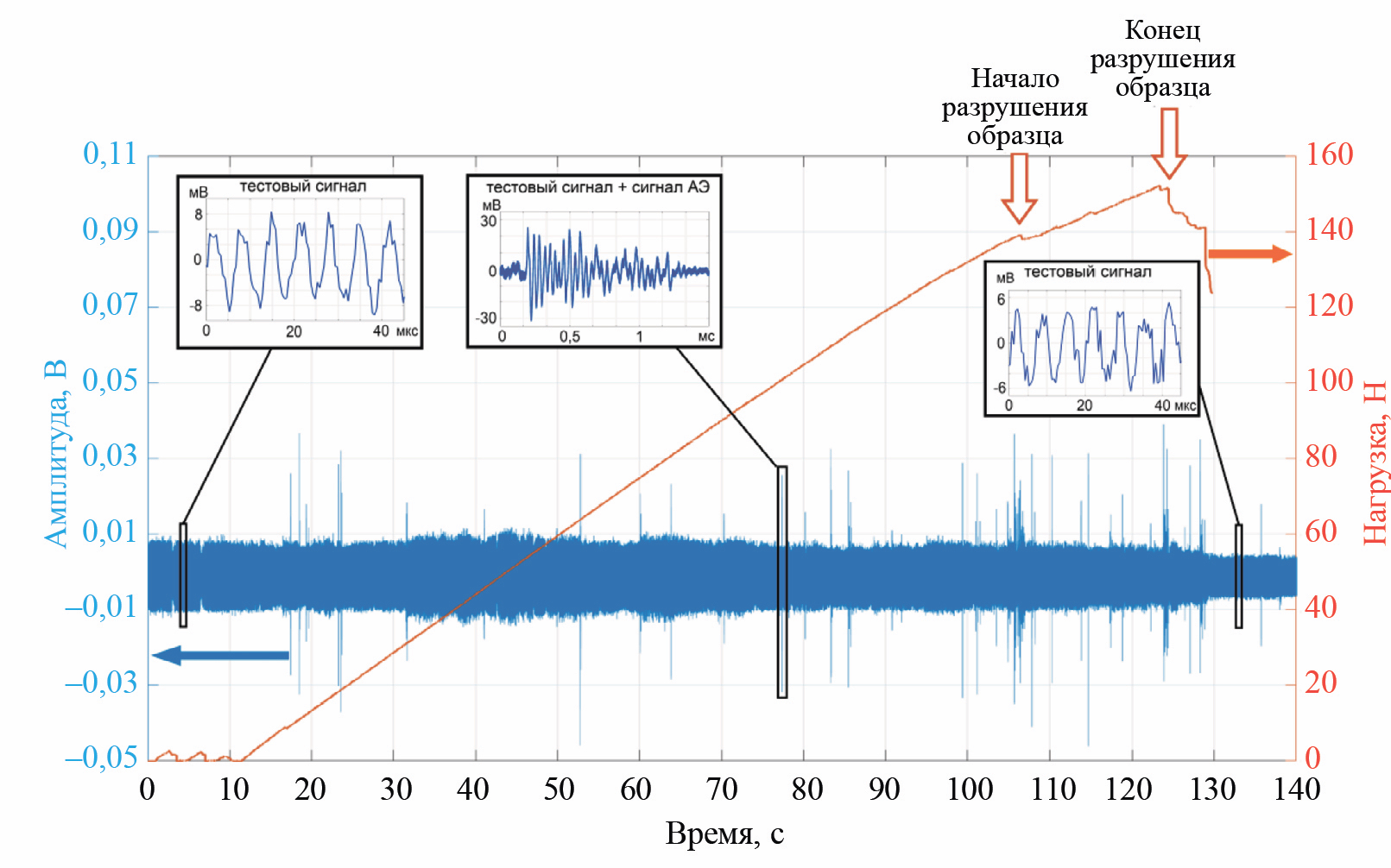 Рис. 2. Динамика изменения сигнала в чувствительном элементе ВОД АЭ, интегрированном в образец ПКМ, в процессе его нагружения в схеме трехточечного изгиба