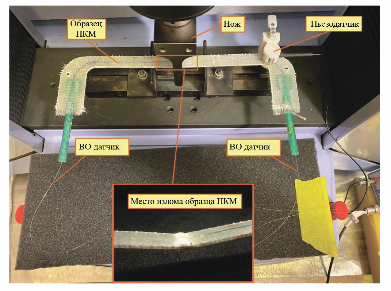 Для того, чтобы определить, насколько оптическое волокно и соответственно ВОД АЭ на его основе, будучи внедренным в ПКМ, способно выдерживать механические нагрузки и обеспечивать при этом эффективную регистрацию волн АЭ, проводились следующие экспериментальные исследования. Образец ПКМ подвергался механическому нагружению на изгиб, при этом с помощью ВОД регистрировались сигналы АЭ, генерируемые возникающими внутри ПКМ дефектами. Для контроля изменений метрологических характеристик самого ВОД, интегрированного в образец ПКМ, а также его устойчивости и надежности, использовался вышеописанный подход с внесением дополнительной фазовой тестовой модуляции (50 кГц, 0,2 рад).
