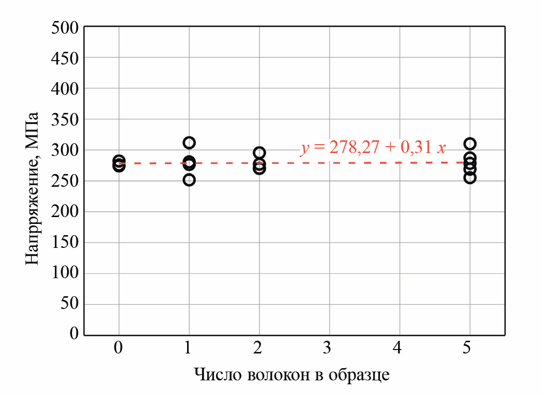 В испытаниях на статический изгиб к образцам прикладывалась возрастающая нагрузка в диапазоне 0—200 Н вплоть до их разрушения. По результатам испытаний определены экспериментальные значения предела прочности образцов с разным числом внедренных волоконных световодов. Анализ полученных результатов (рис. 4) показал отсутствие, в пределах статистической ошибки, закономерной зависимости предела прочности образца ПКМ, при котором происходит его разрушение, от числа встроенных в структуру ПКМ волоконных световодов.