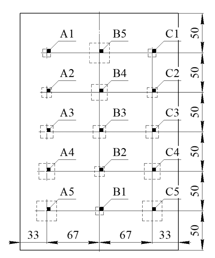 Для экспериментальных исследований был изготовлен тестовый образец (см. рис. 1), склеенный из четырех прямоугольных фрагментов электротехнического листового стеклотекстолита (ГОСТ 12652—74) толщиной 2 мм, в двух из которых предварительно фрезеровкой выбраны углубления в форме квадратов различных размеров и толщиной 1 мм. Таким образом, образец имел три группы дефектов, обозначенных как А, B и C, расположенных соответственно на глубинах 3, 2 и 1 мм от поверхности (см. табл. 1). При этом поверхность образца была покрыта черной краской для обеспечения лучшей поглощающей и излучательной способности.