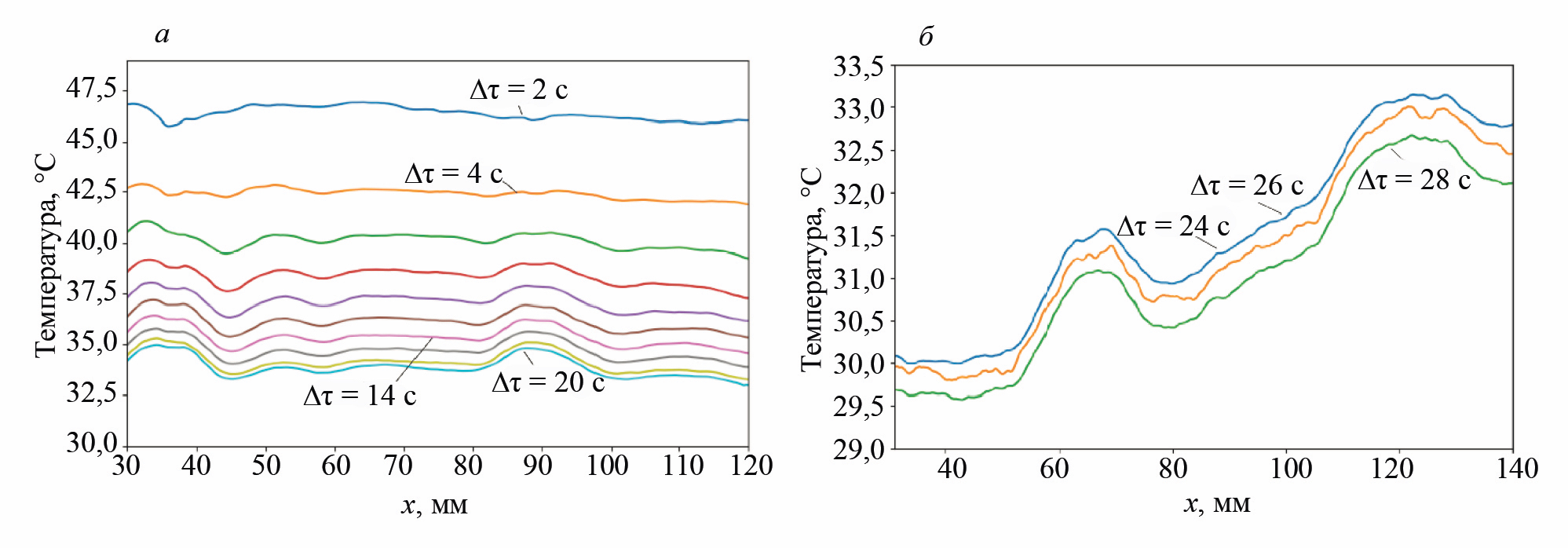 Рис. 4. Термограммы, полученные с интервалом времени 2 с для участков образца, содержащих дефекты B4, B5 (а) и А4, А5 (б).