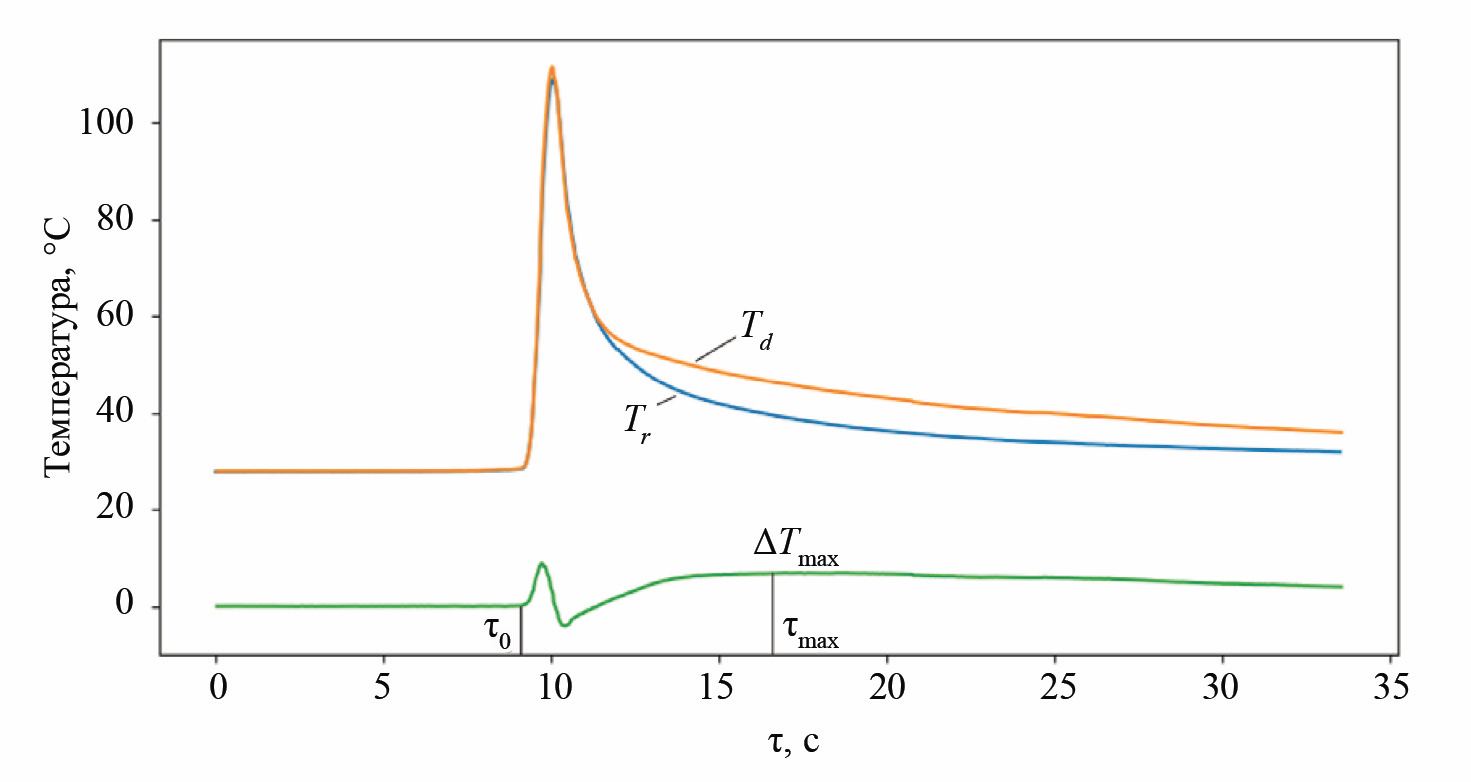 - для каждой области локального максимума температуры на термограмме определяли значение τmax и ΔTmax(τ);
