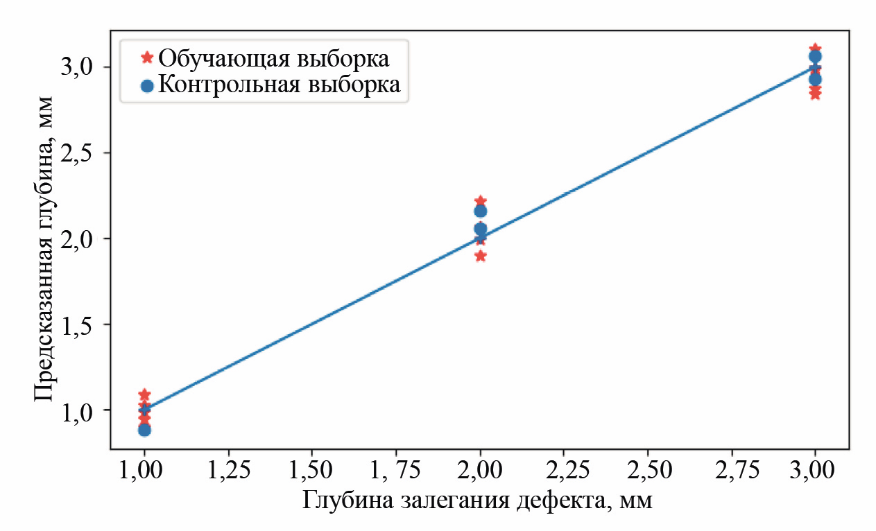 Проведенные испытания по контрольной выборке из пяти измерений подтвердили работоспособность модели для конкретного тестового образца. Метрики качества для модели глубины дефекта оказались равными MSE = ±0,1 мм2; R2 = 0,983, а для ширины дефекта — MSE = ±1,71 мм2; R2 = 0,944.