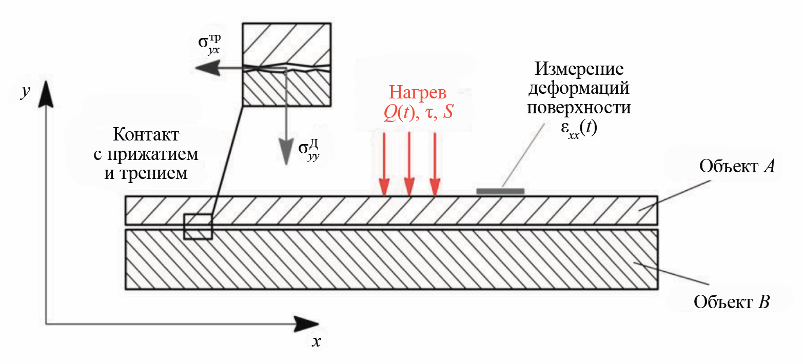 Локальное переменное во времени тепловое воздействие на объект A создает упругие механические напряжения (рис. 1). Возникающие при этом деформации объекта А зависят как от уровня этих механических напряжений, так и от условий на границе с объектом B. Значительное увеличение локальных деформаций выше начальных упругих деформаций приводит к локальному отрыву поверхности объекта A относительно объекта B, а превышение касательными напряжениями предельного значения трения способно вызвать локальное «проскальзывание» поверхности объекта A относительно объекта B. Таким образом, решение обратной задачи о деформировании элементов соединения в процессе локального импульсного нагрева при выполнении условия (2) позволит оценить надежность соединения по интегральному показателю: уровню максимальных напряжений трения.