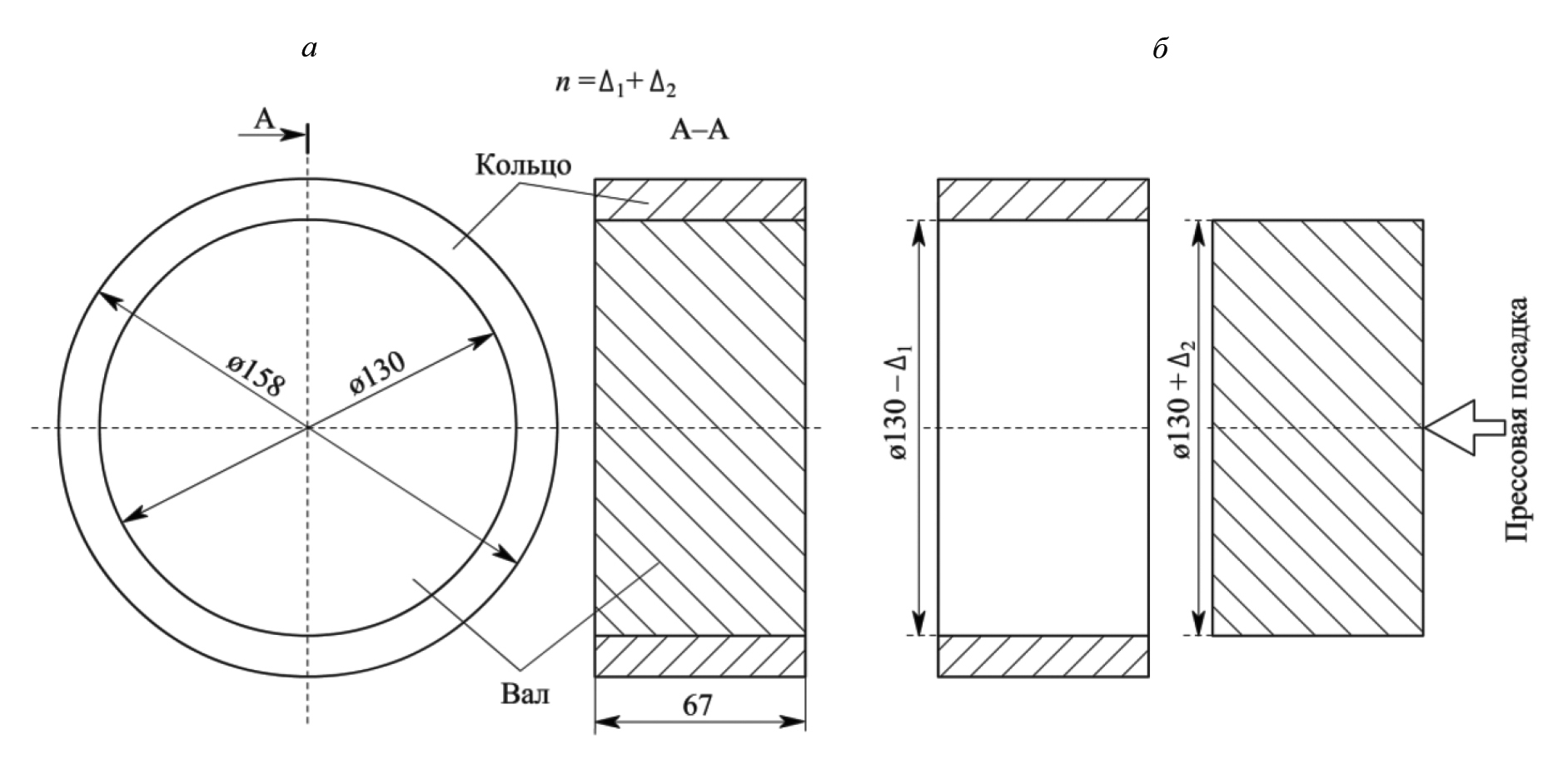 Рис. 2. Эскиз образцов соединений кольца с осью с натягом n после (а) и до (б) прессовой посадки.
