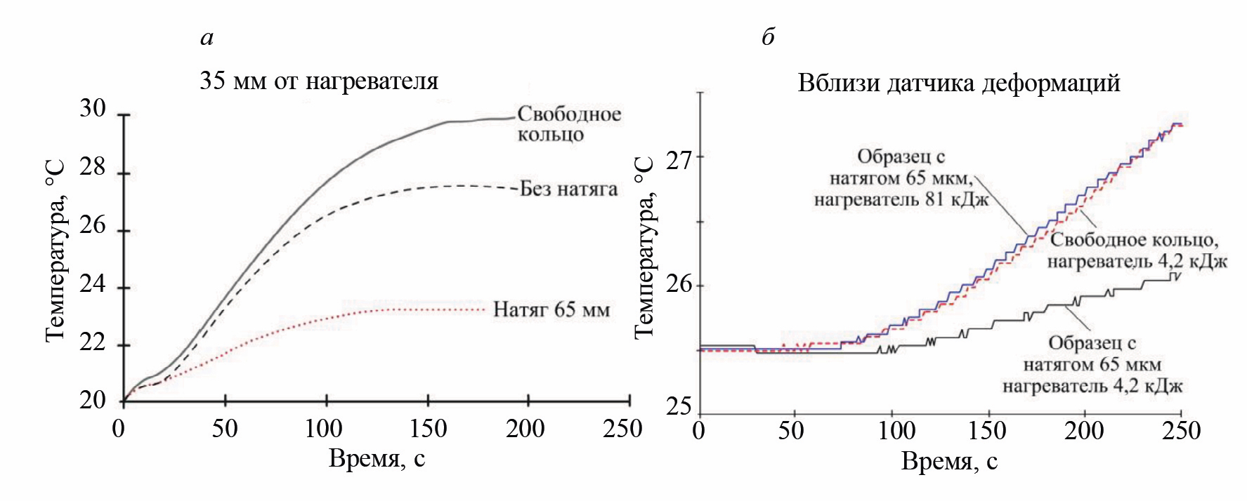 При тепловом воздействии на элемент кольца локальные изменения температуры ΔT создают деформации во всем образце, которые эквивалентны действиям в нагретом элементе материала объемных сил: радиальных и касательных. Деформации вала во времени развиваются немонотонно (см. рис. 8). На начальном этапе нагрева регистрируется растяжение вала, затем на интервале от 80 до 145 с наблюдается локальный максимум и снижение уровня деформаций на 5—10 % (рис. 8а). Уменьшение деформаций связано со уменьшением градиента температуры из-за остывания нагревателя.