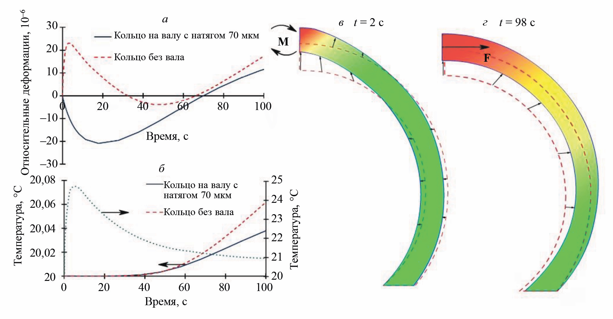 Результаты конечно-элементного моделирования (рис. 7) качественно подтверждают экспериментальные данные (см. рис. 6). При локальном тепловом воздействии на поверхность кольца (рис. 7в, г) однозначно идентифицируются три этапа деформирования. На первом начальном этапе наблюдается неравномерное распределение температуры кольца по толщине (рис. 7б). При этом тепловое воздействие создает эквивалентный момент силы M. Кольцо приобретает эллипсность, при которой в одном сечении размер уменьшается, а в другом — увеличивается. Это вызывает повышение показаний датчика деформаций на свободных кольцах и образцах с зазором. На образцах с натягом этот этап отсутствует, так как вал ограничивает уменьшение диаметра кольца.