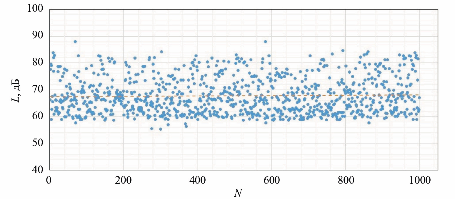 Рис. 5. Уровень шума на расстоянии 30 см от ГЭАП: N — порядковый номер импульса; частота следования импульсов — 2 Гц; межэлектродный зазор 5 мм