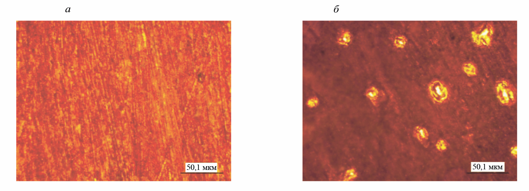 Рис. 6. Фотографии дискового электрода до испытаний (а) и картины микрократеров, образовавшихся на его поверхности (б)