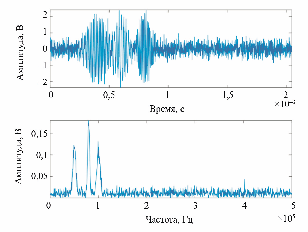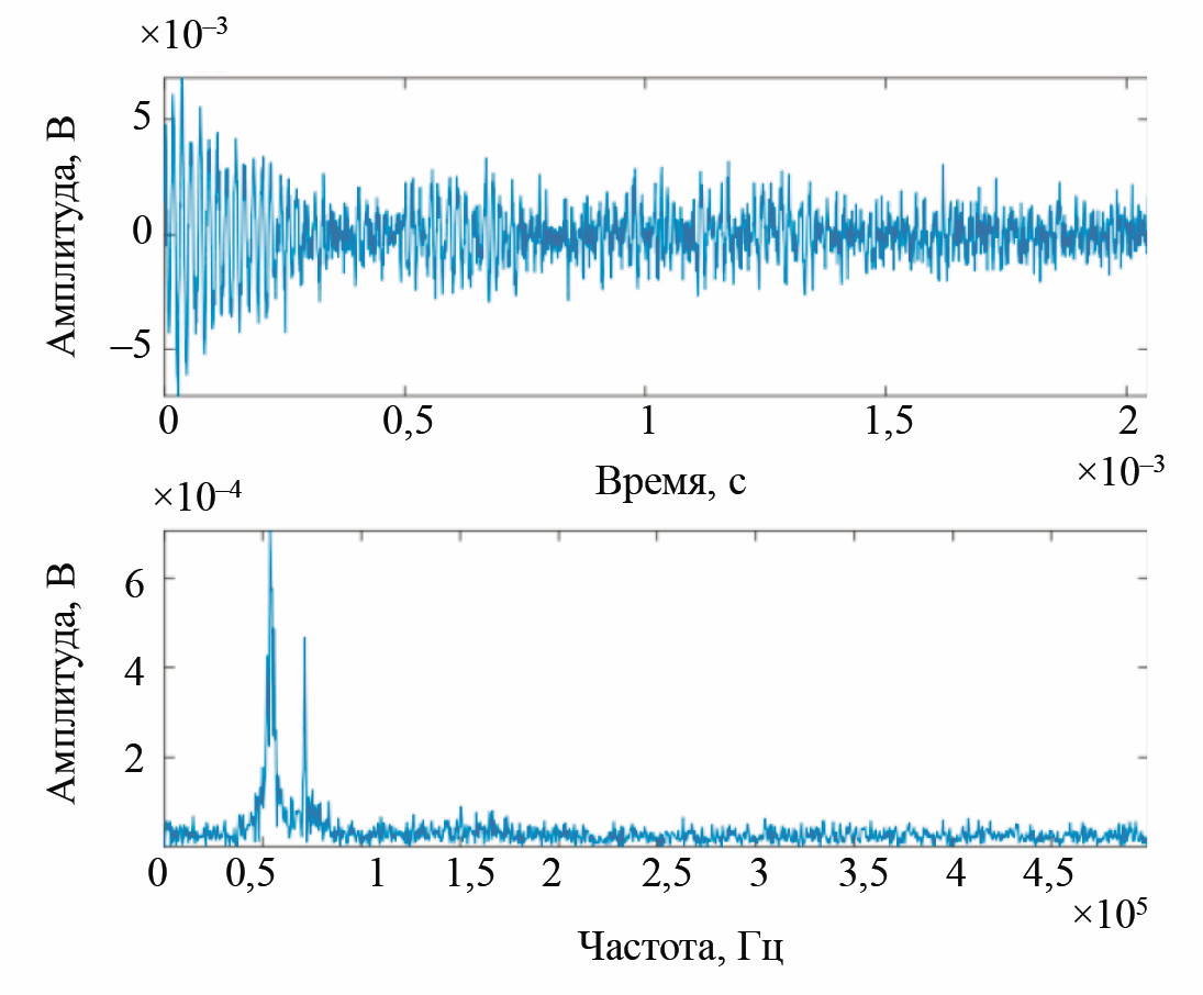 Рис. 5. Амплитуда сигнала, полученного на образце из алюминиевого сплава 6061, во временной и частотной областях