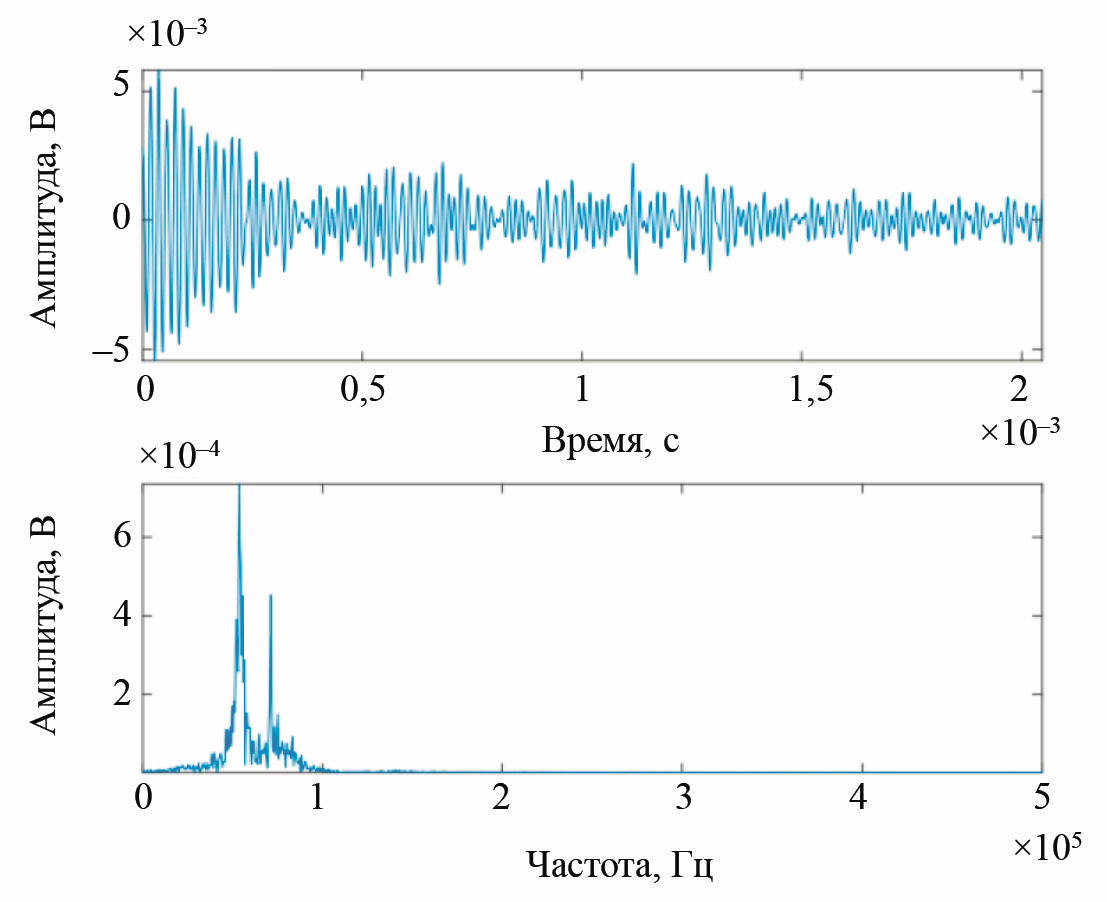 Рис. 7. Амплитуда сигнала, полученного на образце из алюминиевого сплава 6061, во временной и частотной областях после обработки методом ГАВР—КРКА