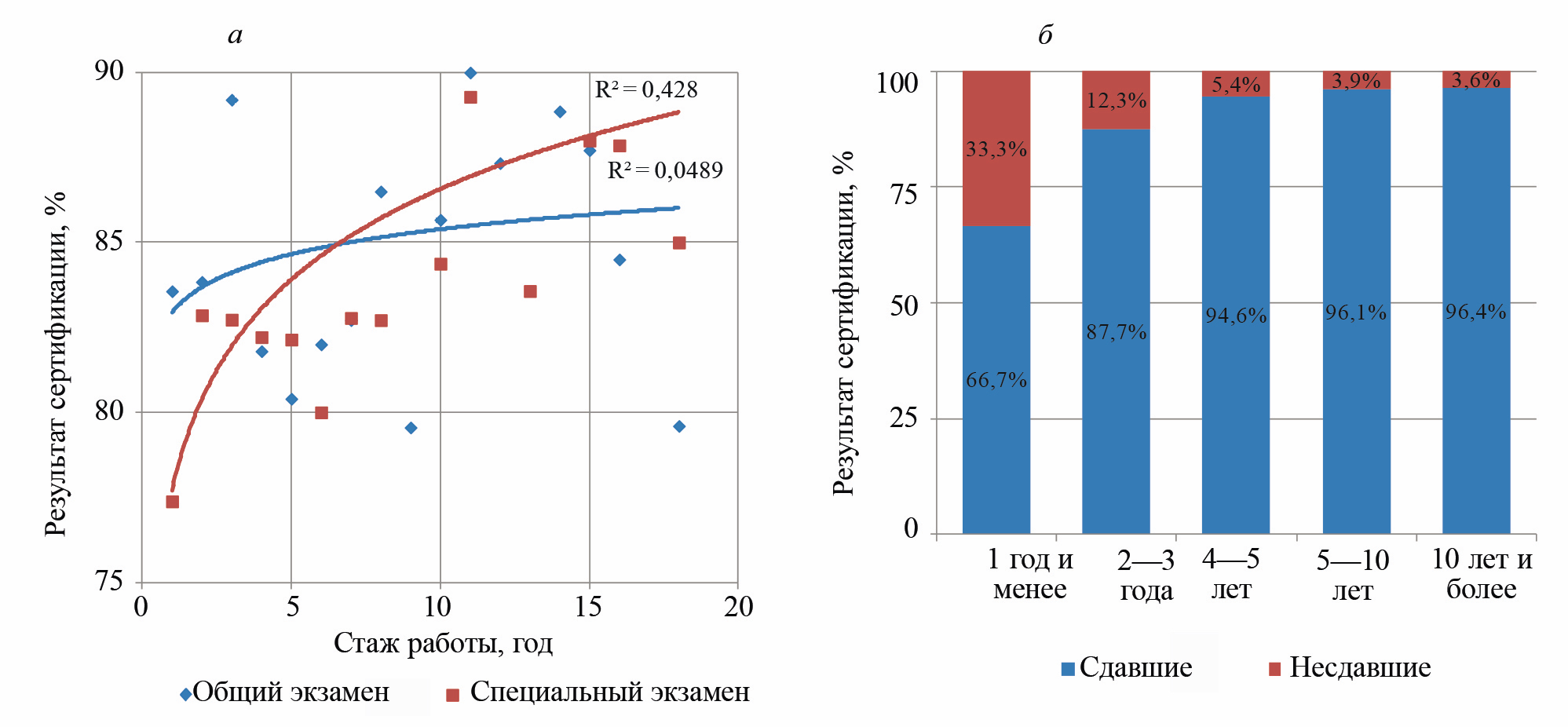 Рис. 2. Результат прохождения общего и специального экзаменов в зависимости от стажа работы (а) и сертификации специалистов в зависимости от стажа работы (б)