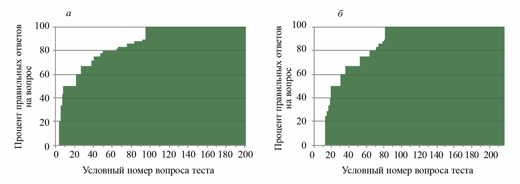 Рис. 7. Распределение правильных ответов по отдельным вопросам теста общего экзамена в 2021 (а) и 2022 (б) гг.