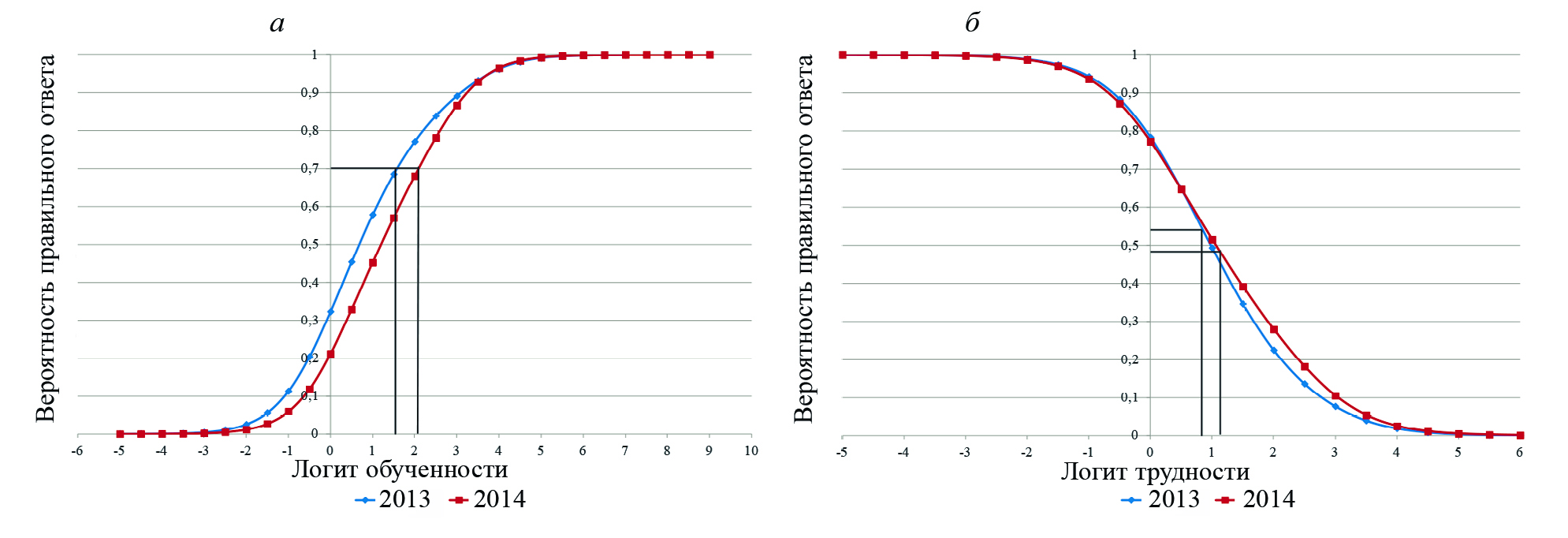 В частности, если разность между уровнем подготовленности участника тестирования и трудностью тестового задания составляет 1 логит, то вероятность верного выполнения этим испытуемым такого задания равна 73 %.