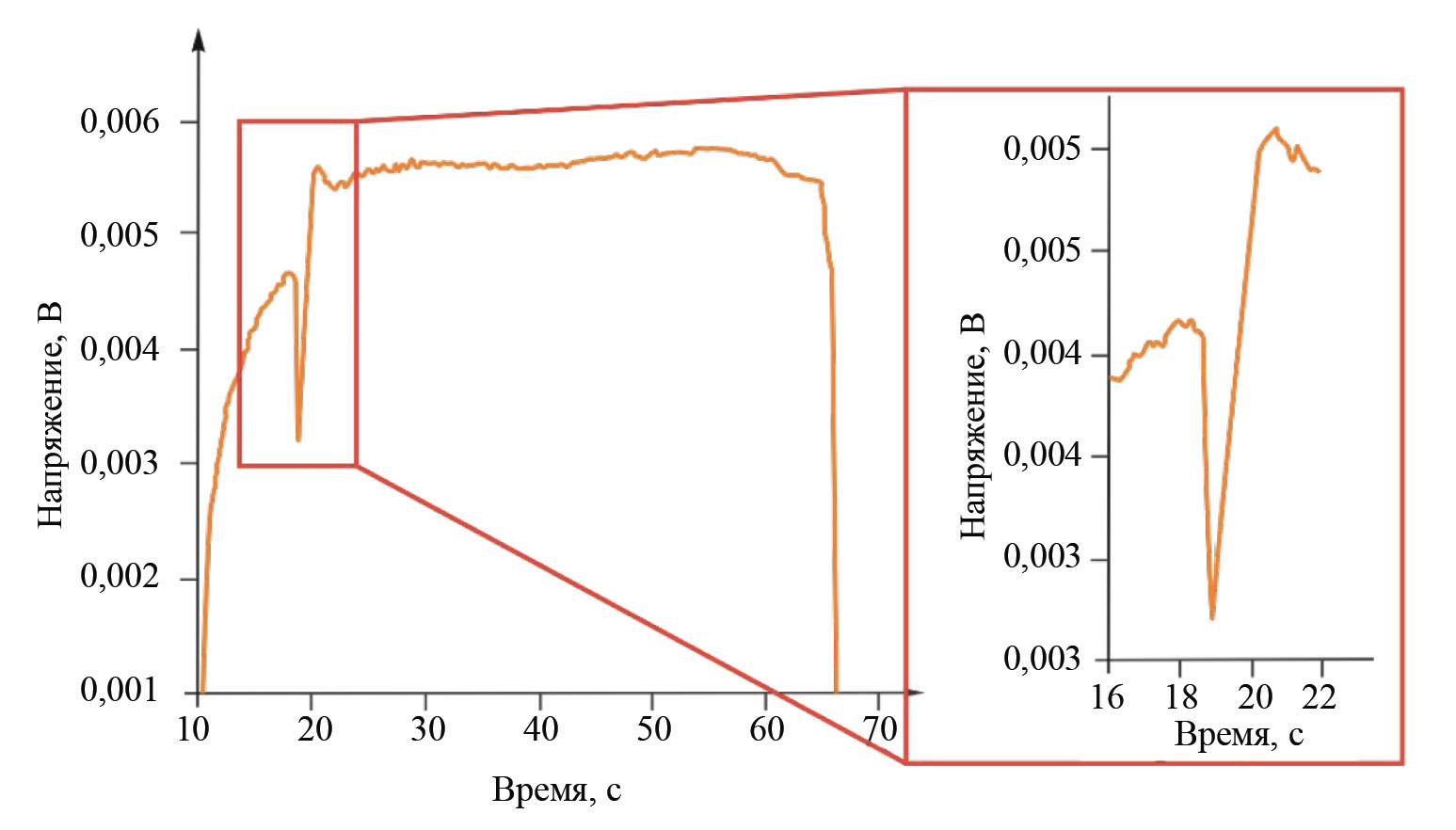 Изменение термоЭДС контактной пары инструмент—деталь показано на рис. 2 [29]. На характеристике наблюдается уменьшение термоЭДС в момент времени 19 с. Это происходит из-за контакта плеча сварочного инструмента с образцом.