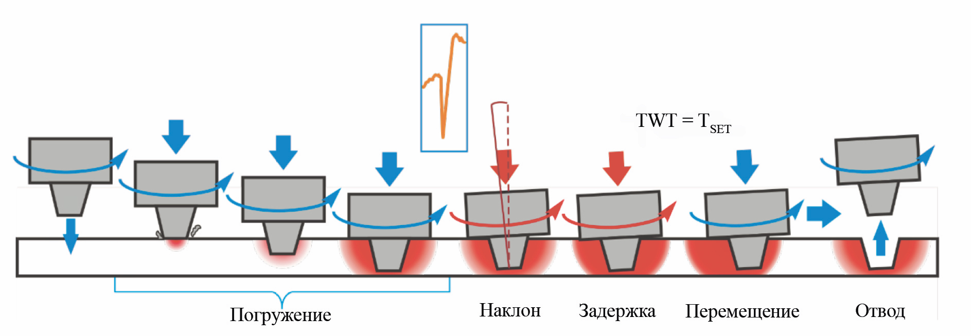 Рис. 3. Стадии сварки трением с перемешиванием с управлением по температуре (красные стрелки обозначают модернизацию терморегулятора) [28]