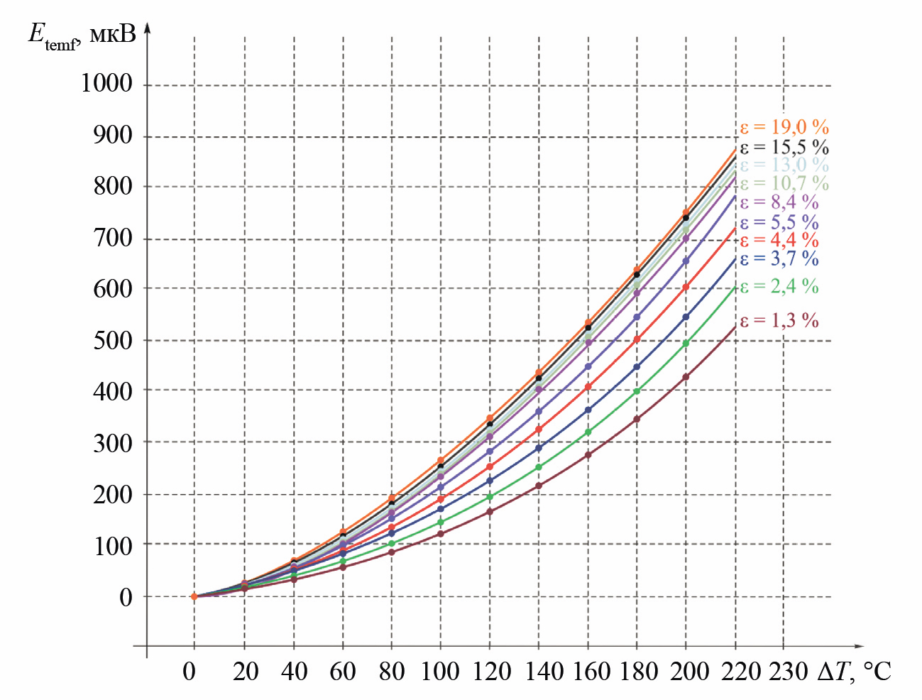 Основываясь на полученной зависимости, авторы показали, что при величине термоЭДС 34,5 мкВ относительная деформация образца, изготовленного из нержавеющей стали X5CrNi1810, составит 11,9 %.