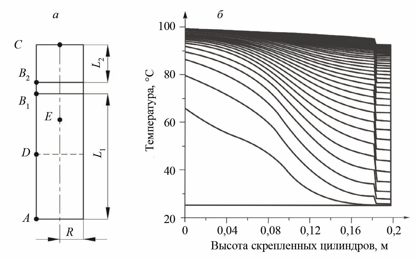 Рис. 11. Схематическое изображение объекта исследования (а) и температурно-временной срез распределения тепла в цилиндре (б)