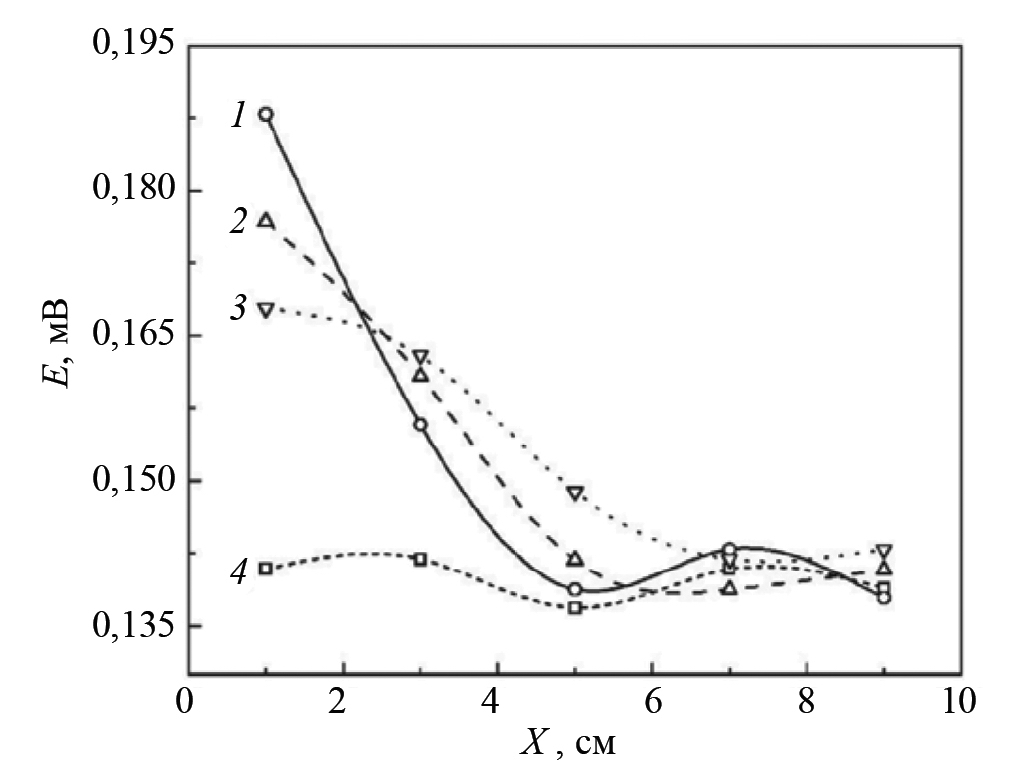 Рис. 18. Зависимость величины термоЭДС от координаты положения зонда: 1 — после наводороживания через 5 ч; 2 — 30 ч; 3 — 75 ч; 4 — до наводороживания. Температура зонда равна 62°С [61]