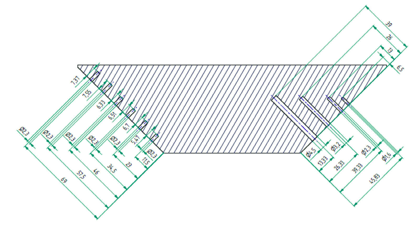 Модельные эксперименты проводили с использованием дефектоскопа АВГУР-АРТ, разработанного и изготовляемого в НПЦ «ЭХО+» [17]. Измерения осуществляли в образце, изготовленном из стали Ст20, эскиз которого приведен на рис. 4. В образце с наклоном граней 45 град были изготовлены шесть ПДО диаметром 2,3 мм на разных глубинах и четыре ПДО разного диаметра на глубине 22 мм. Следует отметить, что точность изготовления ПДО для целей ультразвукового контроля регламентируется ГОСТом [18], в котором оговорены допуски для углов наклона, диаметра, неровности поверхности ПДО и пр. Образец, на котором проводили измерения, не проходил аттестацию в соответствии с упомянутым ГОСТом.