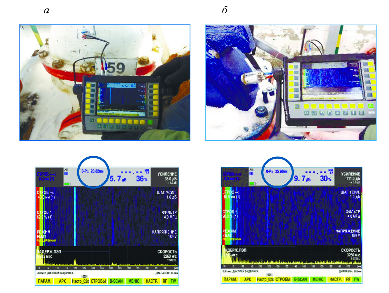 Имея в виду перспективу развития УЗ толщинометрии, отметим некоторые новые возможности, которые дает использование изображений сечений изделия на дисплее цифровых приборов. На рис. 2а время приема донных сигналов может быть зафиксировано как по А-скану (линия развертки желтого цвета в нижней части дисплея), так и по В-скану (изображению сечения). На рис. 2б при прозвучивании крупнозернистого материала донные сигналы на А-скане практически неразличимы, но донная поверхность просматривается на В-скане. Согласно [28], в данном примере толщина материала составила 26±2 мм, т.е. погрешность измерения — около 8 %. Очевидно, что в связи с уширением импульса и менее четкими его границами здесь не приходится говорить о точных измерениях. Однако результат может быть достаточен для оценки технического состояния изделий из крупнозернистых материалов с неплоскопараллельными шероховатыми поверхностями (литые корпуса задвижек, насосов и т.д.). При наличии расслоения глубина его залегания также может быть определена с погрешностью, достаточной для выполнения проверочных расчетов на прочность.