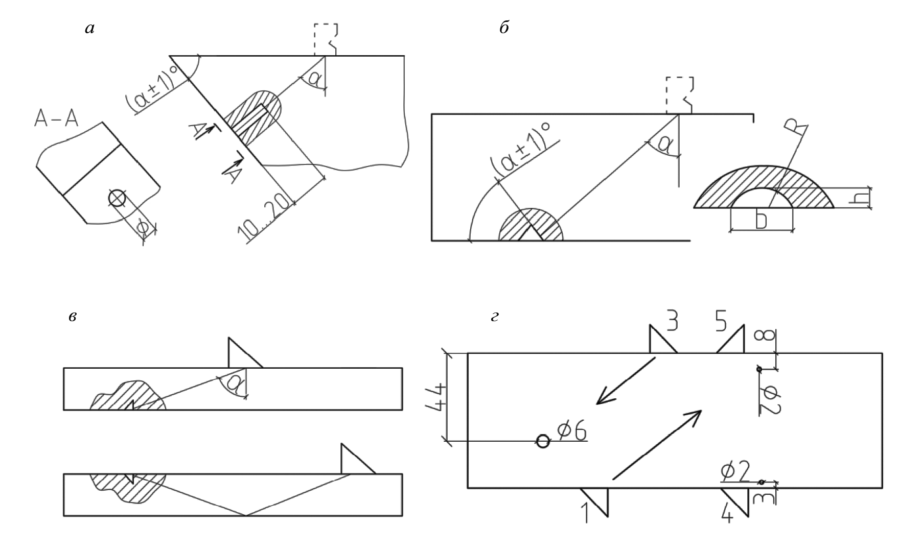 Рис. 6. Отражатели в настроечных образцах: сверление с плоским дном (а); сегментный (б); угловой (в); БЦО (г).