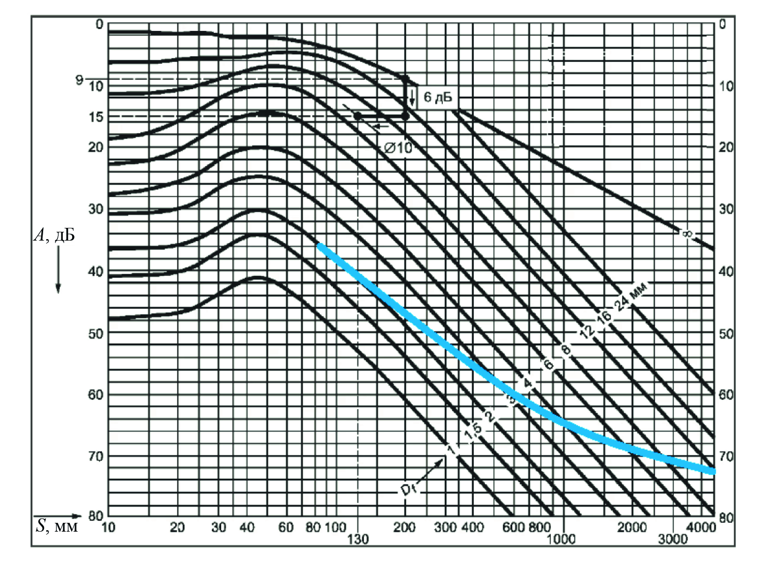 На этой основе разработаны АРД-диаграммы, т.е. номограммы, которые позволяют по амплитуде и времени приема эхосигнала от дефекта оценить его «эквивалентную» площадь (или диаметр) как площадь (или диаметр) сверления с плоским дном, амплитуда отраженного эхосигнала от которого равна амплитуде эхосигнала, принятого от дефекта. Пример такой номограммы приведен на рис. 7.