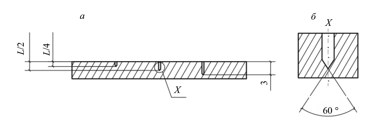 Рис. 12. Фрагмент настроечного образца с пазами, согласно [47]: общий вид (а); регламентированная форма паза (б).