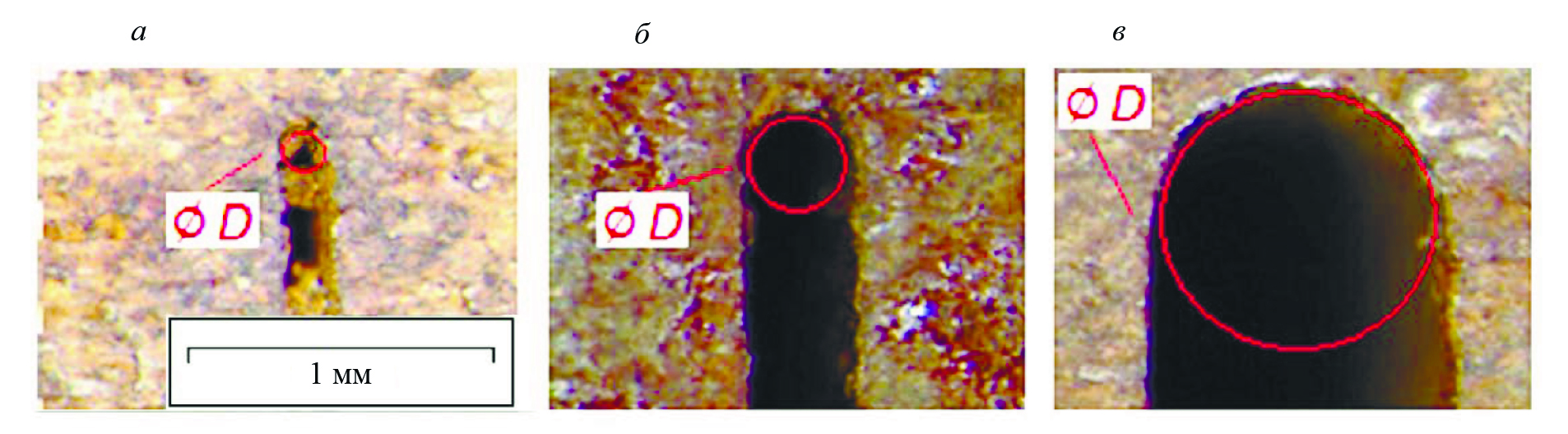 Рис. 13. Макрошлифы пазов раскрытием 0,14 (а), 0,4 (б), 1,0 (в), выполненных электроэрозионным способом [48].