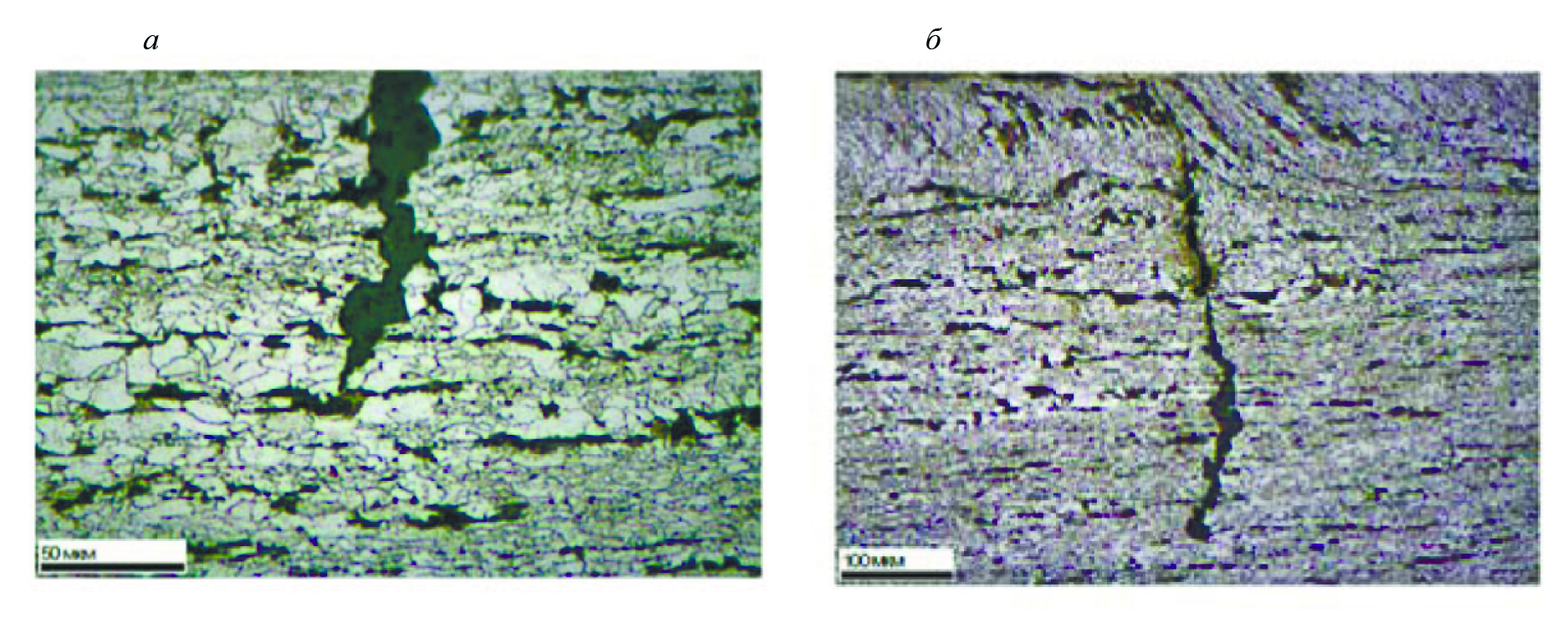 Рис. 14. Трещины в сечении стенки трубы [49, 50]. Масштаб: 1 см : 50 мкм (а); 1 см : 100 мкм (б).