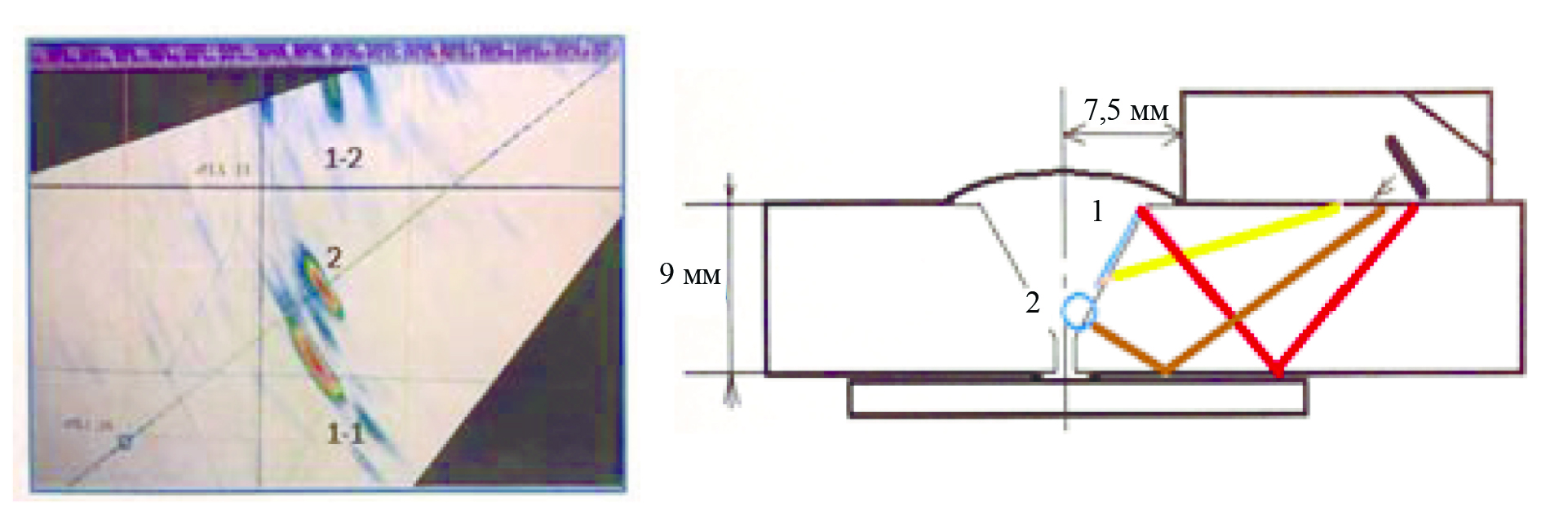Далее рассмотрим перспективы использования различных искусственных отражателей для настройки параметров УЗ контроля с учетом автоматизации сканирования, цифровой обработки сигналов и представления информации о дефектах в сечениях изделий. Один пример был приведен при иллюстрации возможности измерения толщины изделия по В-скану. На рис. 15 приведен другой пример изображения сечения металла: S-скан стыкового сварного шва толщиной 9 мм, полученный фазированной антенной решеткой (ФАР) с углами ввода в диапазоне 45—70о. При наложении этого изображения на разделку кромок видно, что сигналы 1-1 и 1-2 на прямом и отраженном лучах получены от несплавления 1, а сигнал 2 — на прямом луче от шлакового включения 2.
