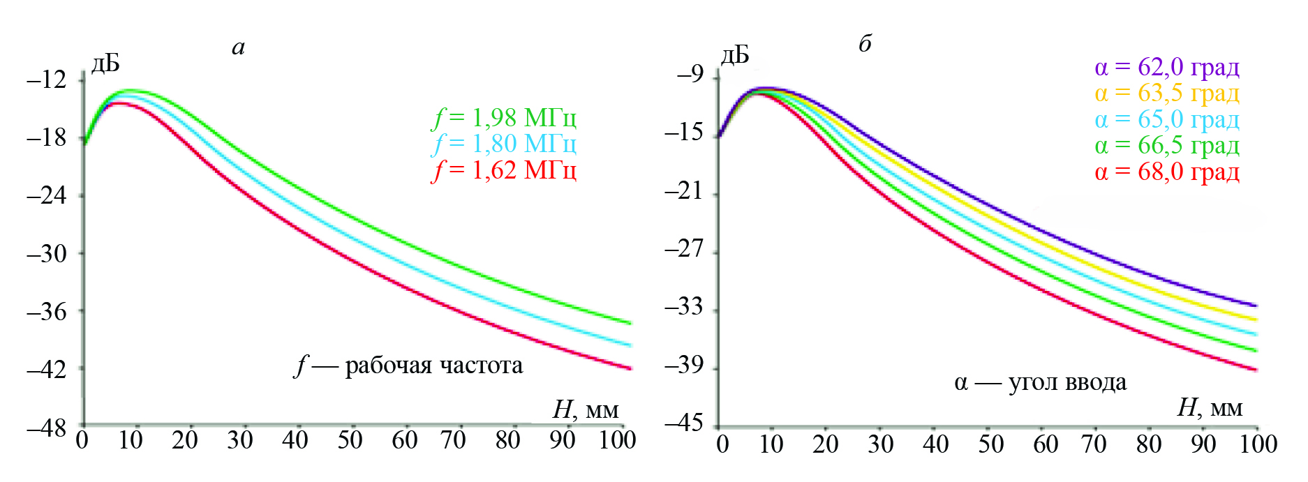 Пример оценки по (6) — кривая синего цвет на рис. 7. Поскольку зависимость (6) более пологая, чем в (3) для сверления с плоским дном, то точность настройки чувствительности по сквозному сверлению может быть ниже, чем по отверстию с плоским дном. Однако для БЦО небольшого диаметра (например, dБЦО = 2bБЦО = 2 мм) при контроле малых толщин, когда расстояния r невелики, из (3) и (6) следует, что зависимость A(r) остается достаточно крутой для обеспечения точности настройки чувствительности в пределах 1 дБ.