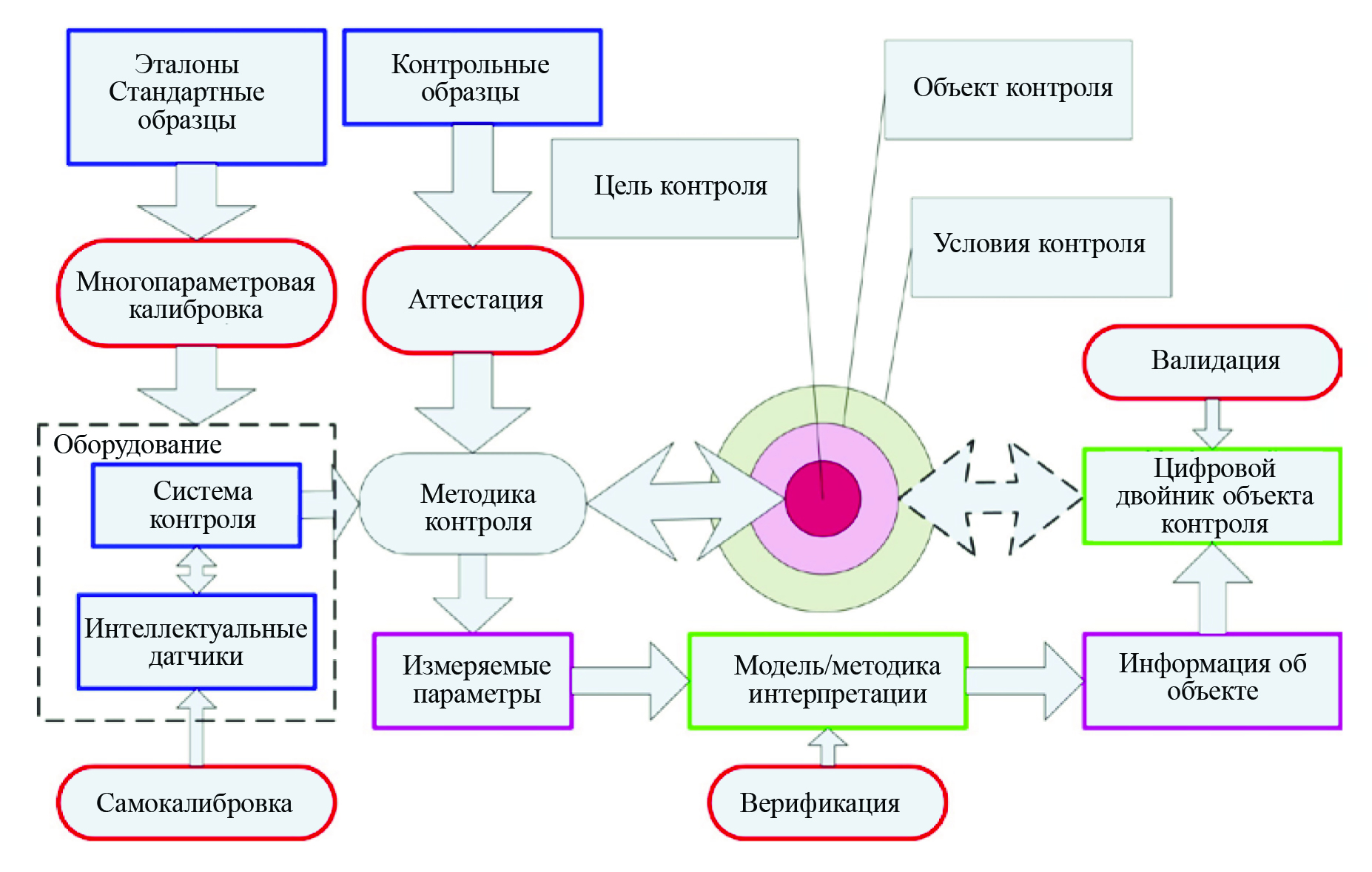 - С учетом современных трендов построения оборудования неразрушающего контроля и сформированных задач автоматической интерпретации измерительной информации с целью определения типа дефектов структуры (несплошностей) и их геометрических параметров, общая схема системы неразрушающего контроля (дефектоскопии) и условий выполнения технологических операций, в том числе в составе работ по диагностированию технически сложных систем, приведена на рис. 22, согласно [9, 64]. В рамках этой схемы необходимо обеспечивать валидацию (подтверждение соответствия заданным требованиям) цифровых моделей дефектов и объекта контроля, верификацию (апробацию) методик контроля, выполнение работ по контролю с автоматизацией различных операций. В состав таких операций могут входить (все или некоторые): калибровка и настройка оборудования путем выявления искусственных и/или реальных дефектов в настроечных образцах, сканирование, передача и запись первичных результатов, расшифровка получаемых акустических изображений, разбраковка каждого выявленного дефекта и изделия в целом, архивирование данных.