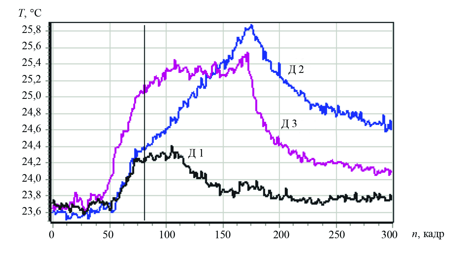 Анализ температурных профилей рис. 4 показывает, что зоны Д2 и Д3 ведут себя одинаковым образом, а температура в них возрастает на 2,1—2,3 °С относительно начальной температуры в процессе УЗ стимуляции. Следует отметить, что после выключения работы магнитострикционного преобразователя температура в зонах дефектов Д2 и Д3 продолжала незначительно расти, что может свидетельствовать о «всплывании» температурного сигнала дефекта, расположенного под керамическим покрытием. Подобная задержка температурных сигналов во времени может быть использована для оценки глубины залегания дефекта.