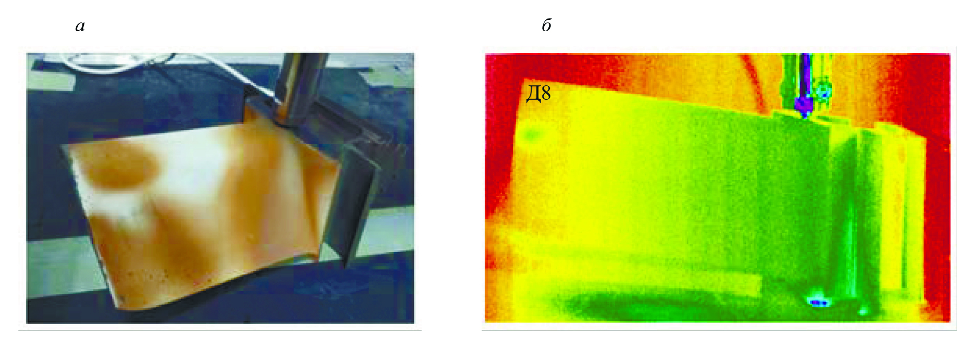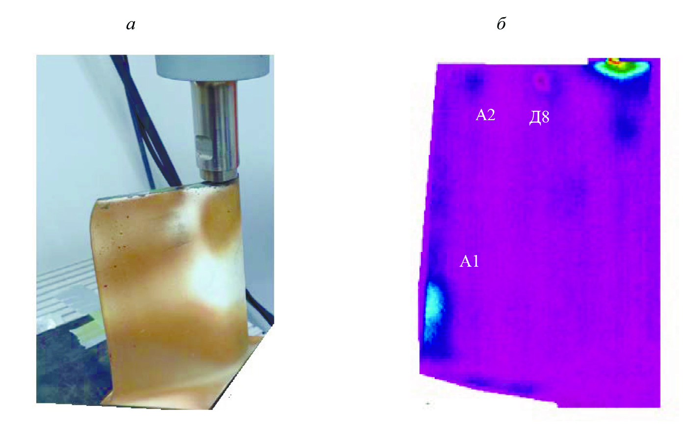 Рис. 3. Результат термоакустического контроля стороны А лопатки турбины (точка ввода УЗ колебаний № 1): лопатка турбины при УЗ стимуляции (а); термограмма лопатки турбины с выраженными температурными аномалиями (б).
